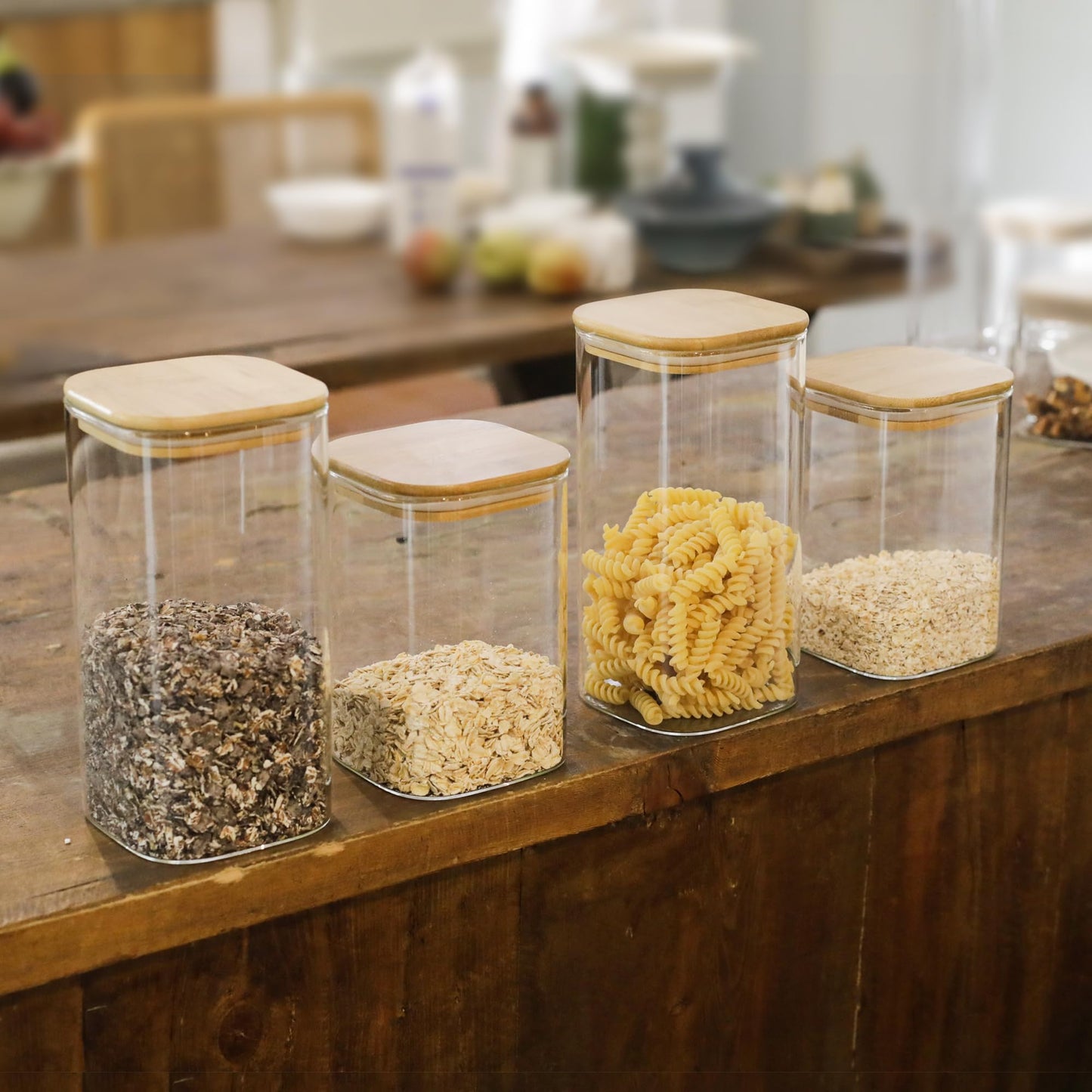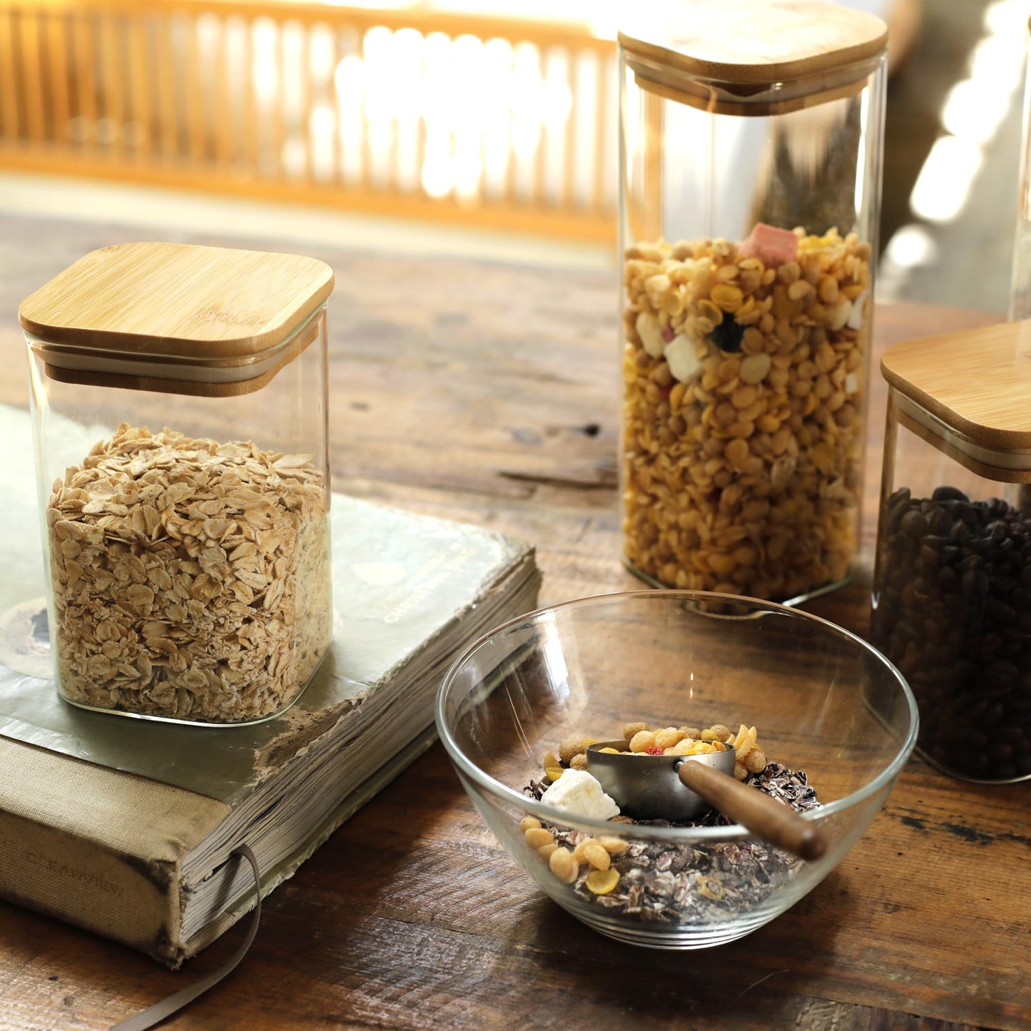- SCHÖNER QUADRATISCHER BAMBUSDECKEL– Die quadratischen Aufbewahrungsgläser überzeugen durch ihren Bambusdeckel. Mit der ansprechenden Kombi aus Bambus und Glas wertest du deine Kücheneinrichtung im Handumdrehen auf und mithilfe von Schubladen erhaltet ihr einen noch besseren Überblick.