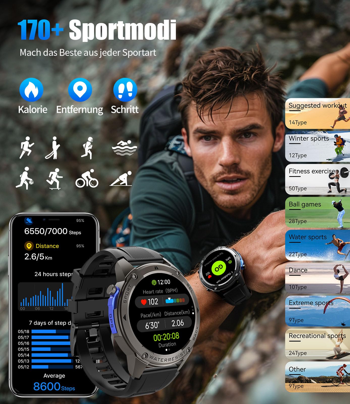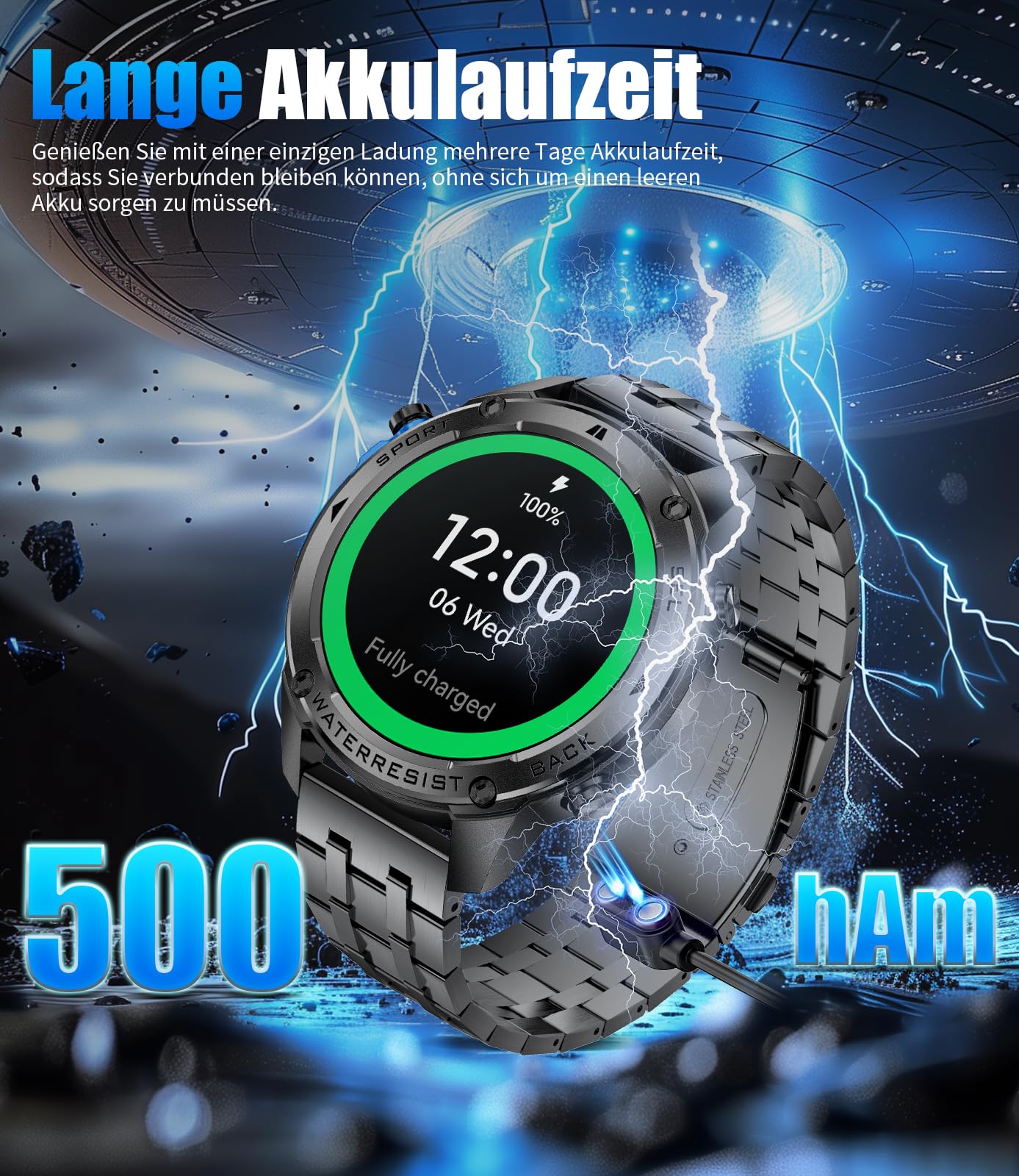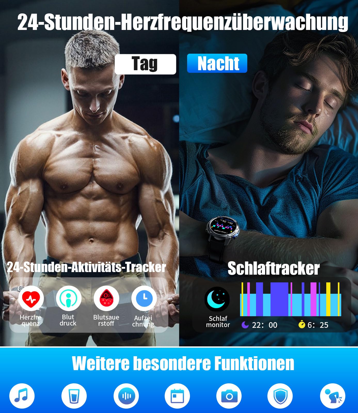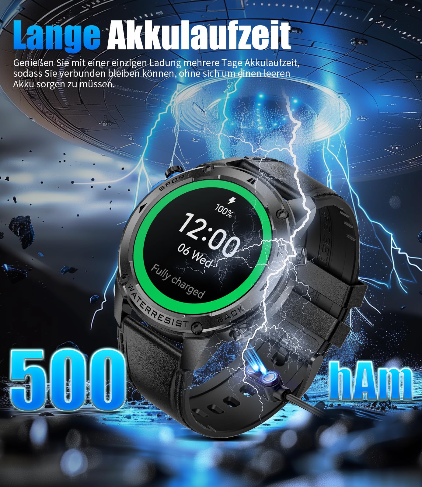 - 【Robuste Militärstandards & Stilvolles Design】: Entwickelt nach strengen militärischen Standards, überzeugt diese Smartwatch mit herausragender Stoßfestigkeit und Wasserdichtigkeit.Ihre langlebige Edelstahl-Lünette und das Gehäuse aus hochwertiger PC-ABS-Legierung trotzen extremen Bedingungen – die perfekte Kombination aus Zuverlässigkeit und Eleganz für Ihre Abenteuer.