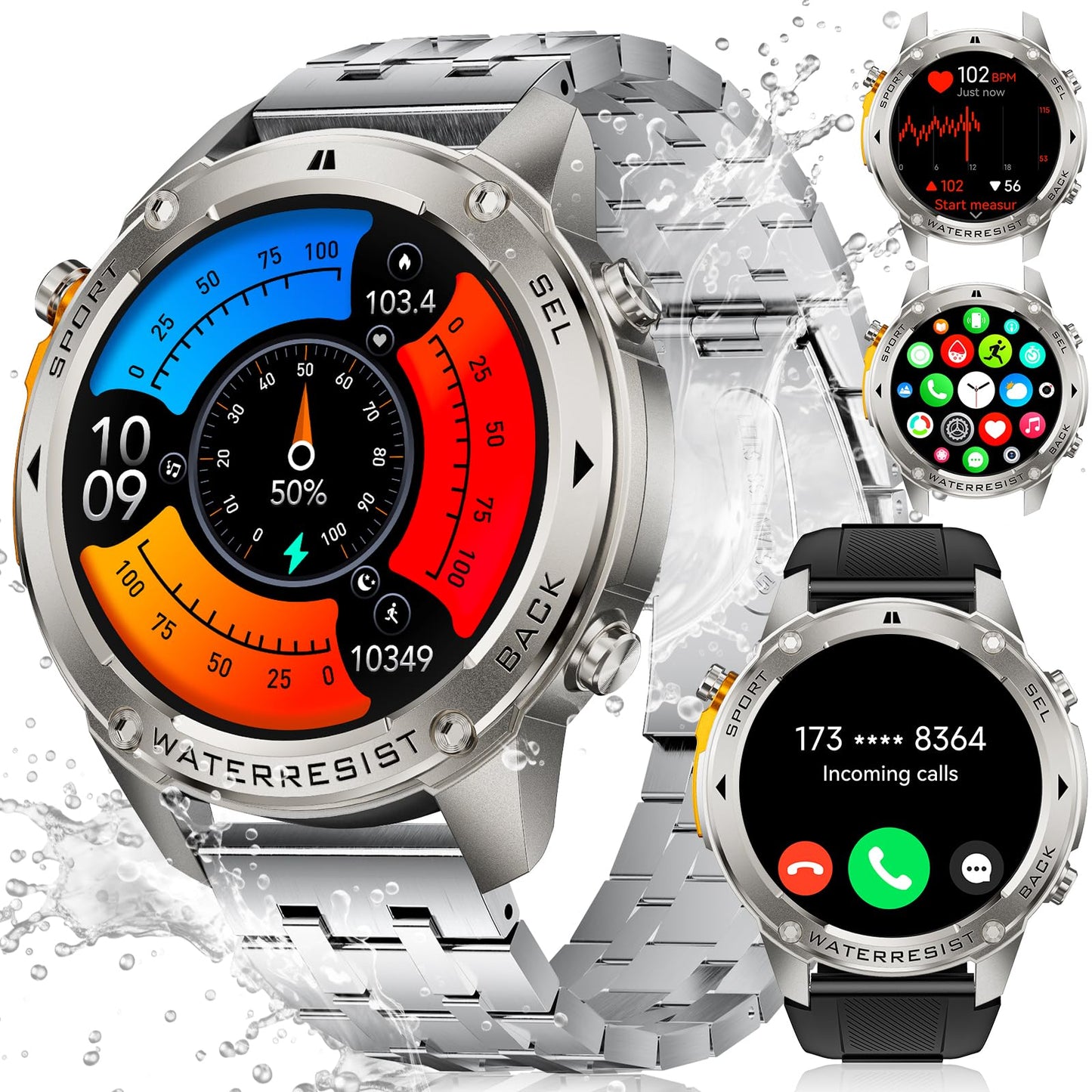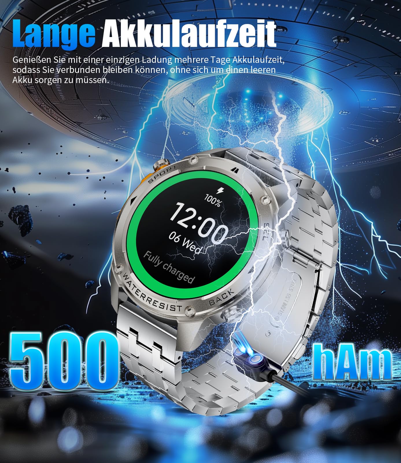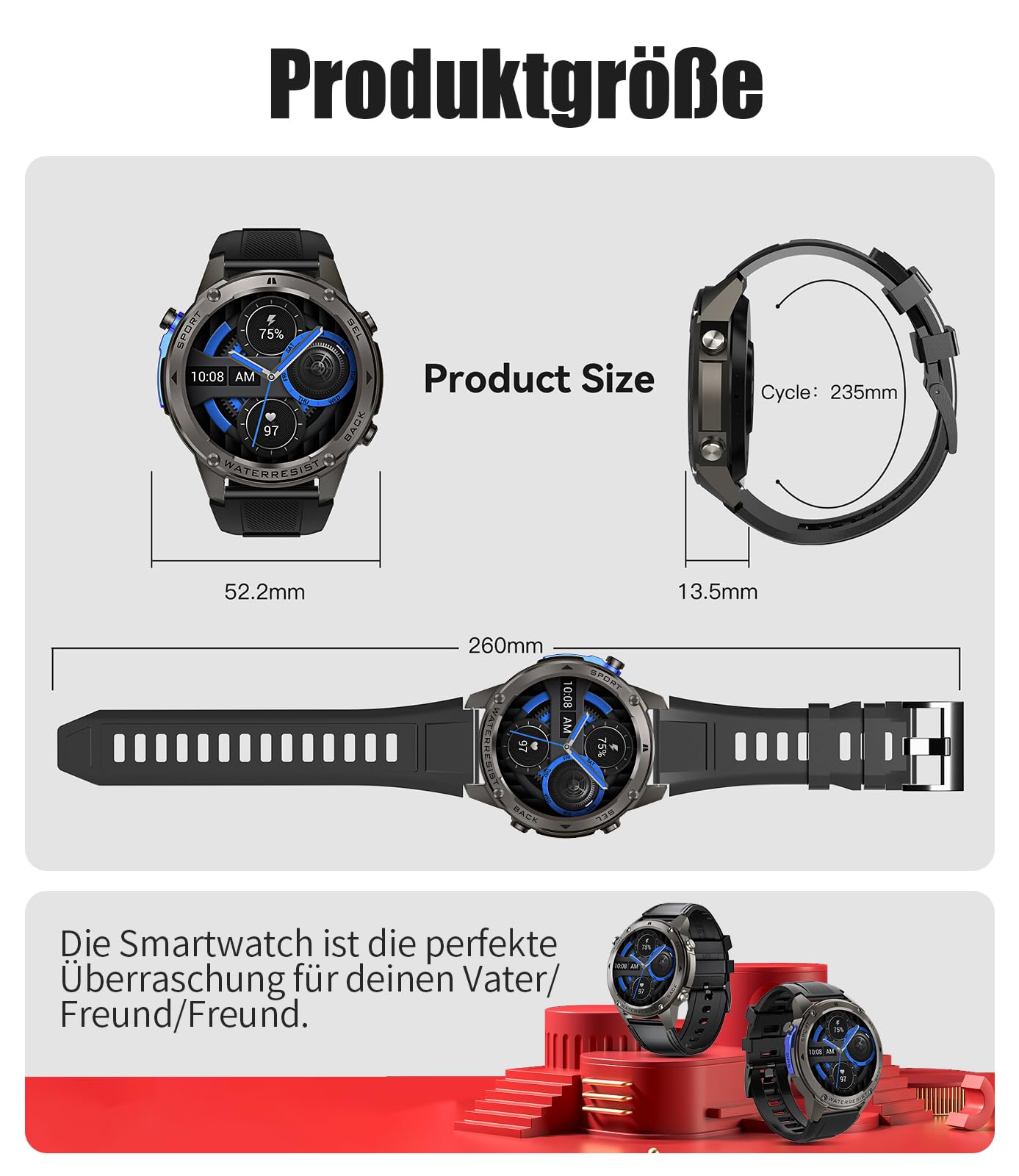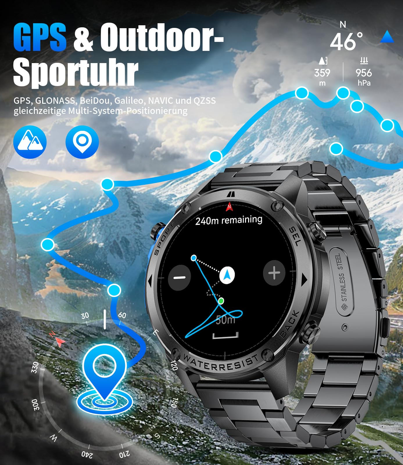 - 【Robuste Militärstandards & Stilvolles Design】: Entwickelt nach strengen militärischen Standards, überzeugt diese Smartwatch mit herausragender Stoßfestigkeit und Wasserdichtigkeit.Ihre langlebige Edelstahl-Lünette und das Gehäuse aus hochwertiger PC-ABS-Legierung trotzen extremen Bedingungen – die perfekte Kombination aus Zuverlässigkeit und Eleganz für Ihre Abenteuer.