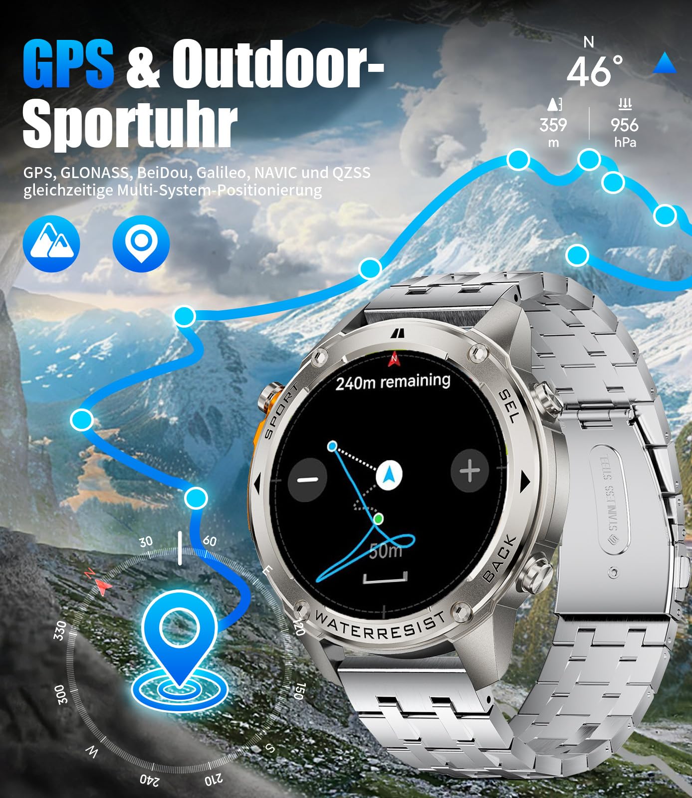 - 【GPS-Tracking & 2 Armbänder】: Diese GPS-Smartwatch bietet Dualfrequenz-L1+L5 für höchste Präzision und unterstützt GPS, GLONASS, Beidou, Galileo, NAVIC sowie QZSS – für eine simultane Mehrsystem-Ortung. Sie kommt mit zwei Armbändern: einem eleganten gunmetal Edelstahlarmband für einen formellen Look und einem robusten schwarzen Silikonarmband für Sport und Alltag. Das gunmetal Edelstahlarmband bietet eine Kombination aus edlem, strapazierfähigem Design und hochwertiger Verarbeitung, ideal für anspruchsvolle Anlässe und einen modernen Stil. (Hinweis: Diese Uhr verfügt nicht über Offline-Karten. Außerdem enthält der Link Anleitungsvideos für die effektive Nutzung der Uhr.)