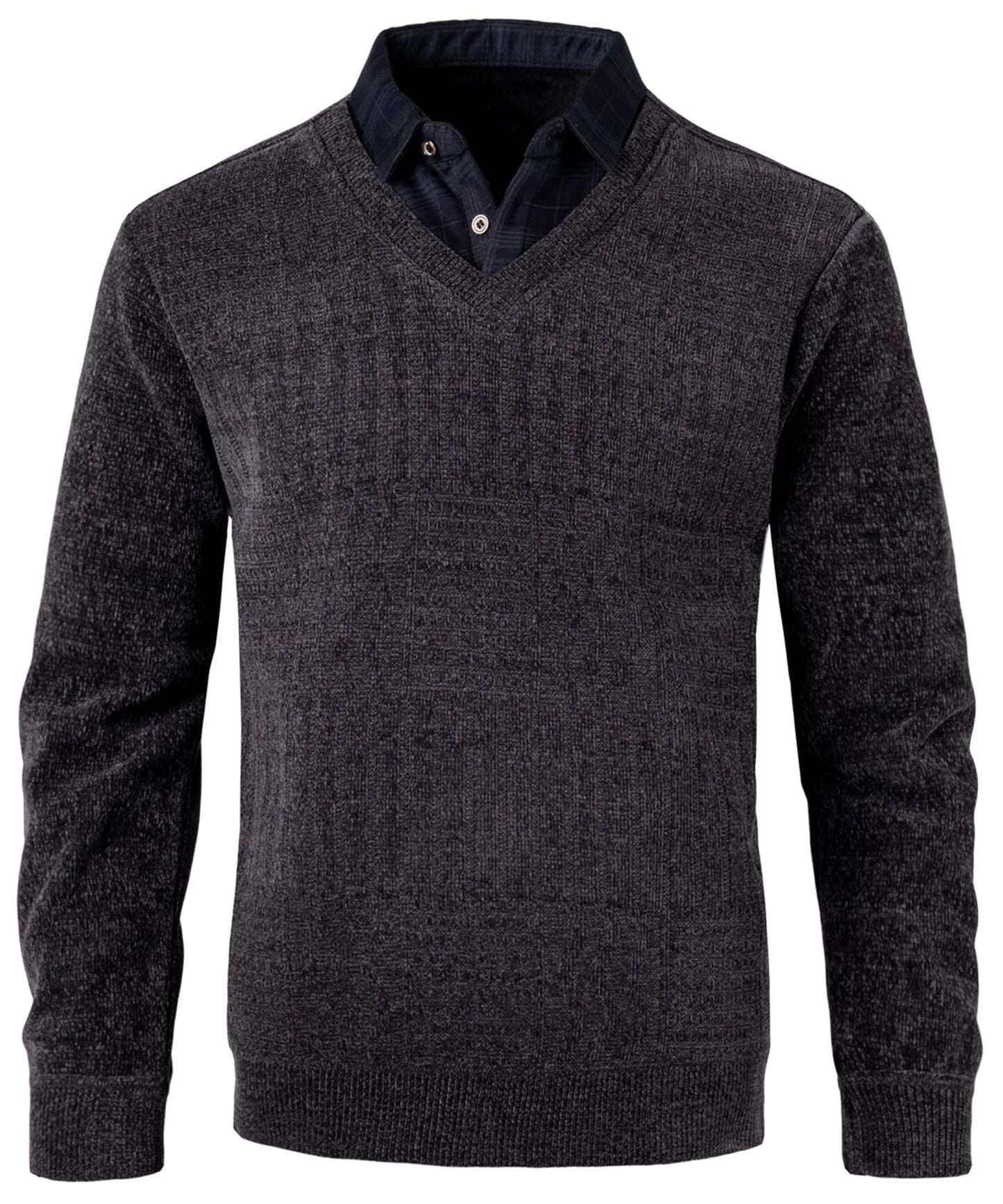 Men’s 2-in-1 V-Neck Sweater – Slim Fit Chenille Pullover with Mock Shirt Collar