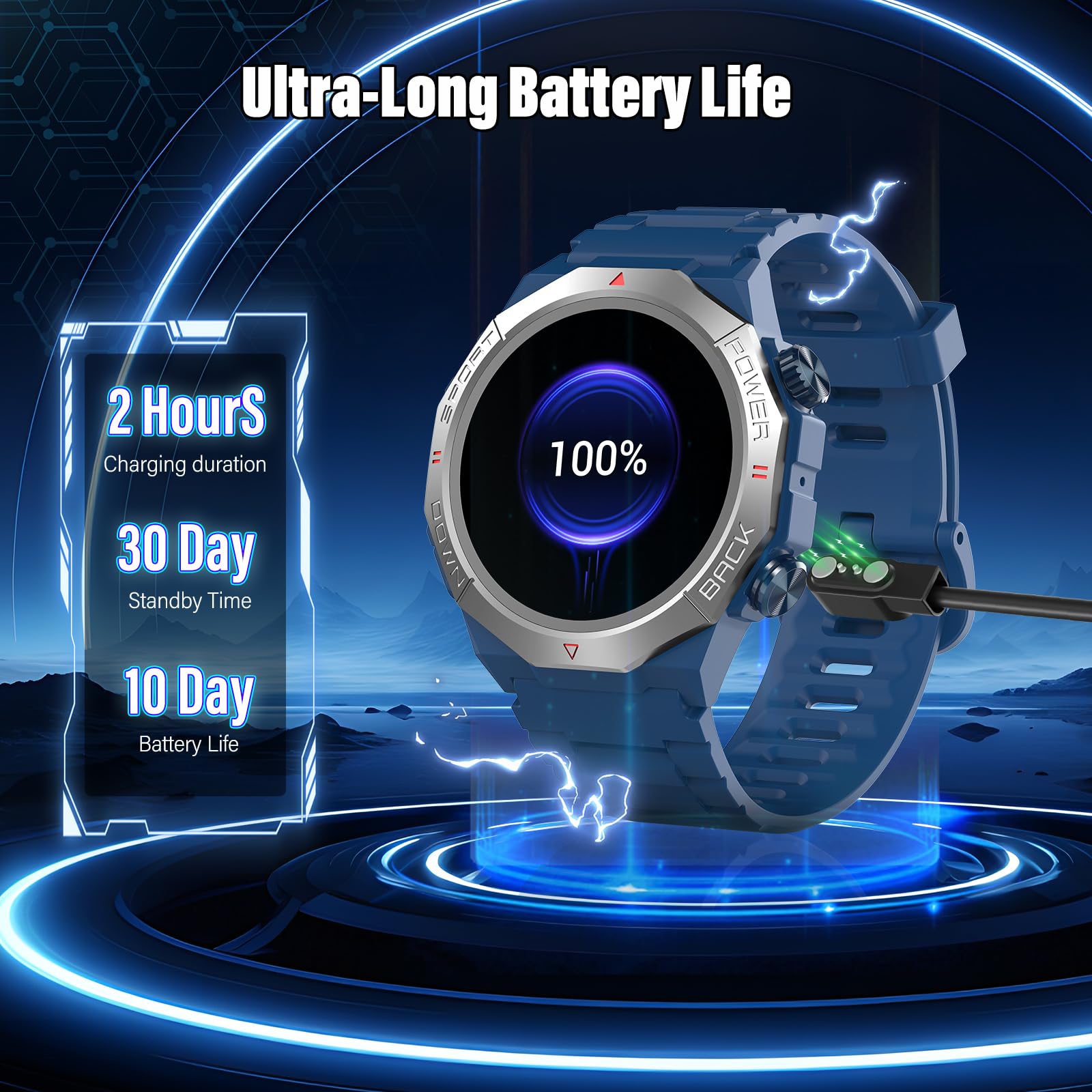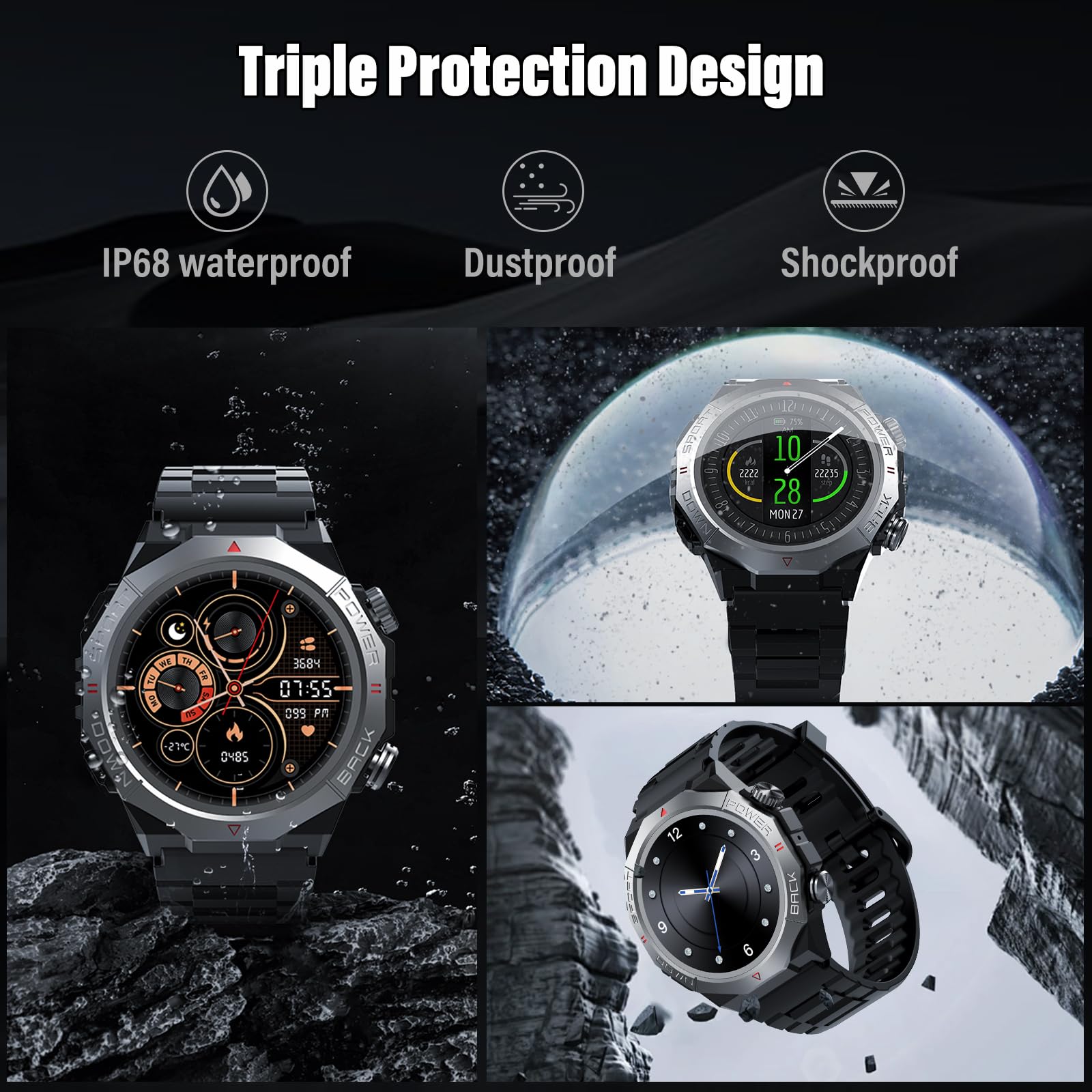 - Robuste Militäruhr: Militär-smartwatch verfügt über einen hochfesten Legierungsrahmen und einen hochauflösenden, kratzfesten Bildschirm, der mit dreifachem Schutz gegen Stöße, Stürze und Kratzer ausgestattet ist. Egal ob beim Wandern, intensiven Training oder im Alltag – sie bietet zuverlässige Leistung und ist die perfekte Wahl für Outdoor- und Sportliebhaber.