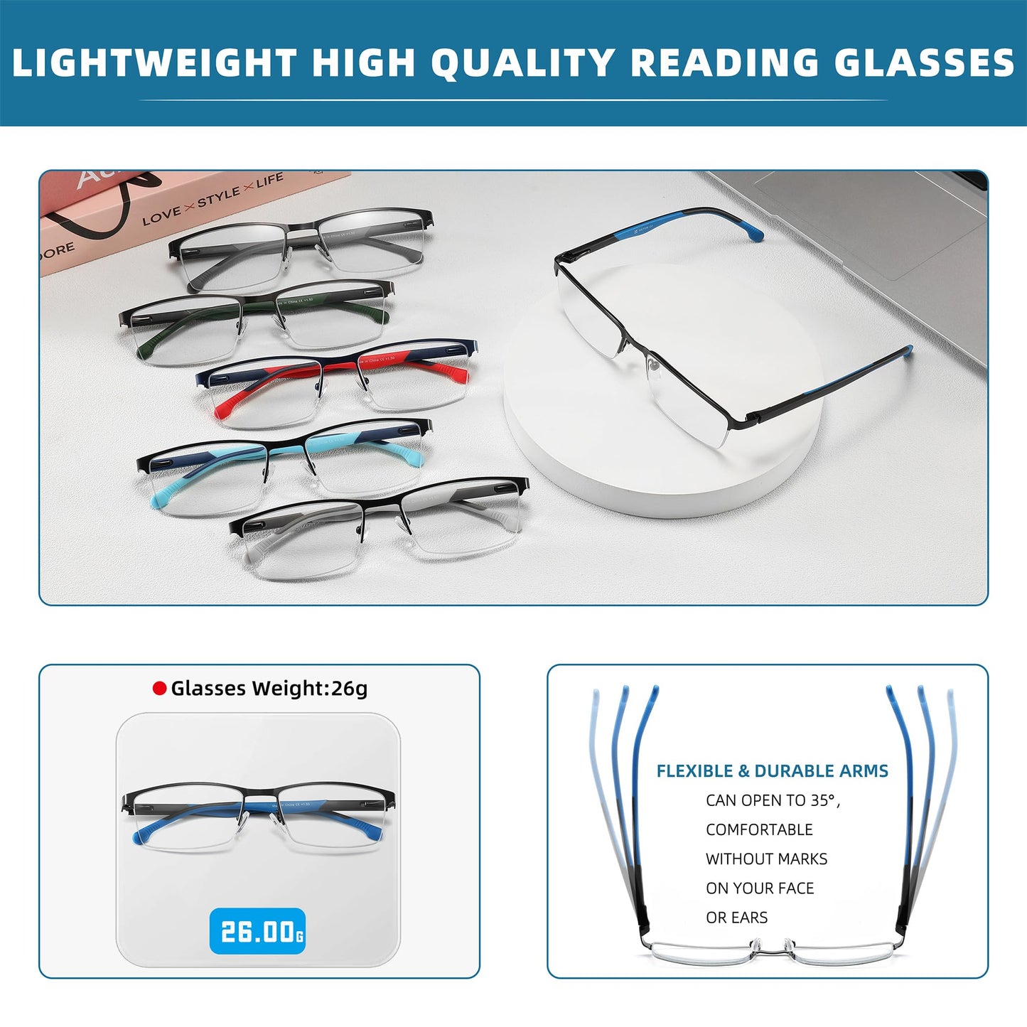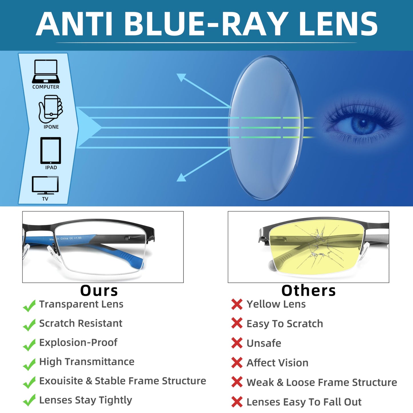 - Anti-Blaulicht-Lesebrille fur Herren, rechteckiger Vollrahmen-Metallstil. Edelstahlmaterial, schlanke Kontur, aber leicht, jedes Paar wiegt etwa 28 Gramm, robust und langlebig. Die Tragegr??e ist fur die meisten Menschen geeignet
