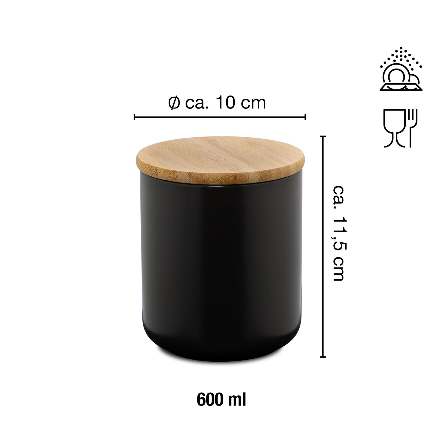 - PRAKTISCH – 3 Schwarze Keramikdosen mit Deckel aus Bambus, 3 verschiedene Größen: 10cm Ø x 8cm = 400ml, 10cm Ø x 11,5cm = 600ml, 10 cm Ø x 16cm = 900ml. Perfekt für Küche oder als Aufbewahrungsdose Bad