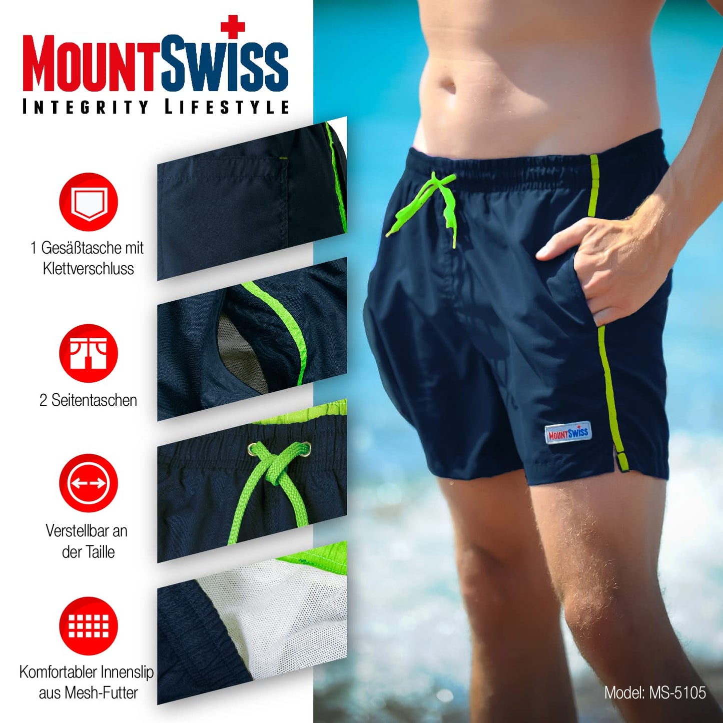 Enjoy summer in style with the Mount Swiss “Dario” men’s swim shorts—perfect for swimming, beach days, and casual lounging. These stylish shorts combine functionality with fashion thanks to their modern cut, lightweight feel, and quick-dry polyester fabric. Designed in Europe and crafted with high-quality stitching and materials, they offer maximum comfort and durability. Featuring mesh-lined side pockets and a secure back pocket with Velcro closure, they’re ideal for active days in and out of the water. The elastic waistband with adjustable drawstring ensures a snug, comfortable fit for every body type.