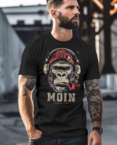 - Stylish men’s T-shirt with bold “Moin” gorilla music-themed front print
