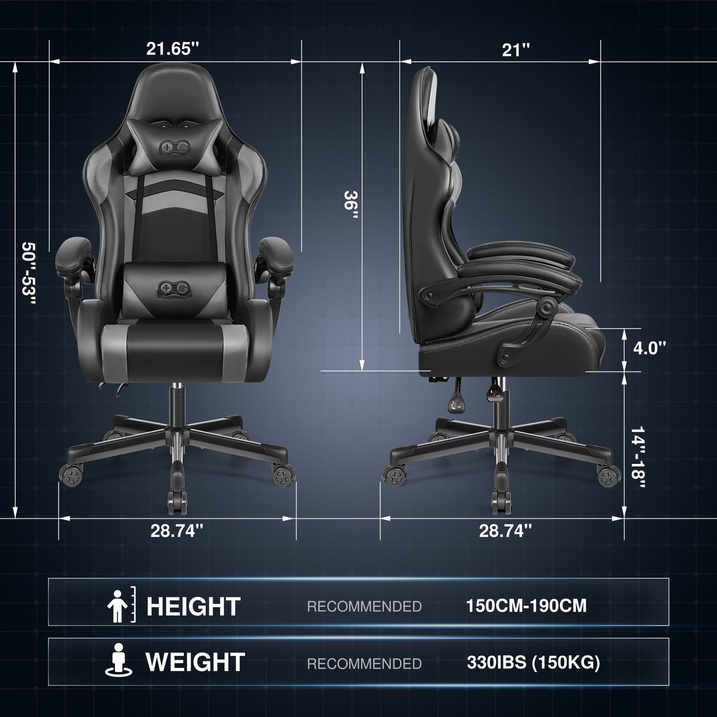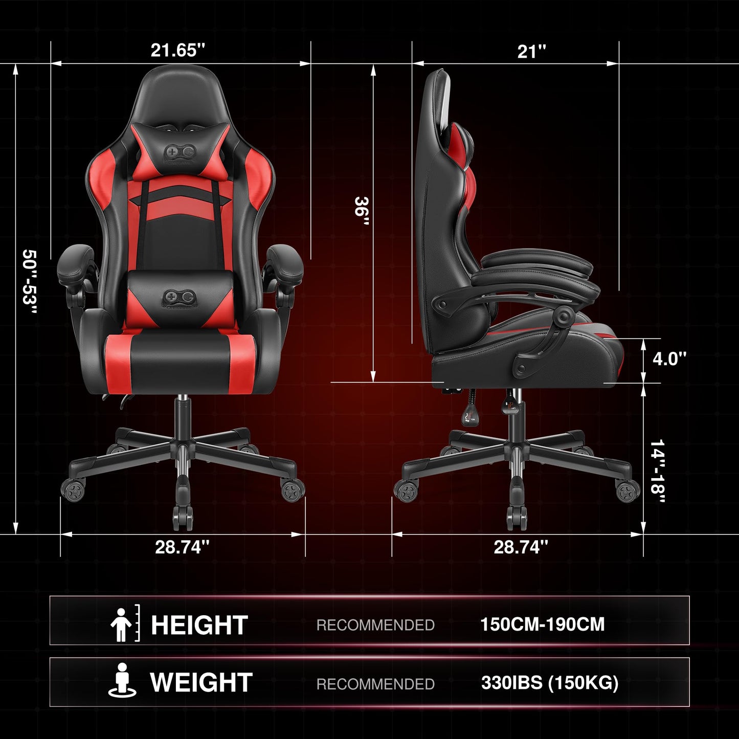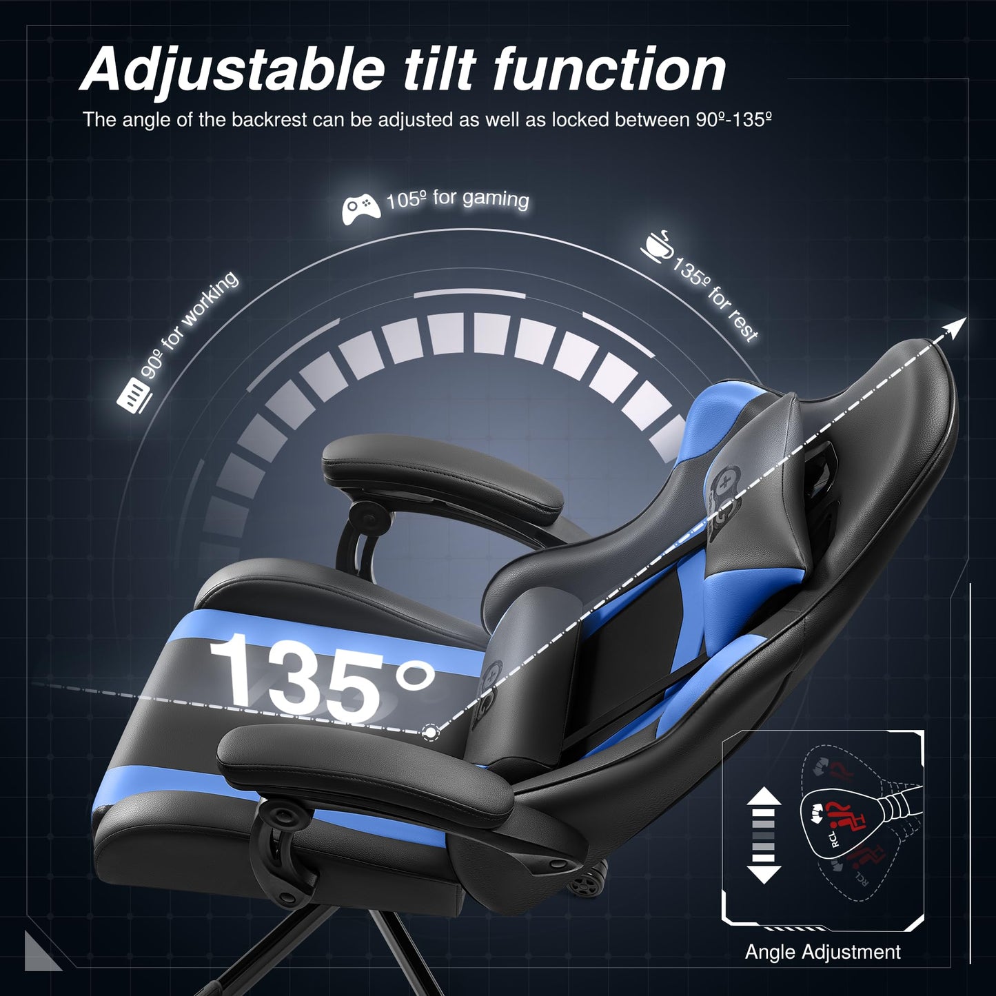 - [Mehrere Einstellungen] Die Rückenlehne des Gaming-Stuhl kann zwischen 90º und 135º geneigt werden, damit Sie auch bei längeren Arbeits- und Spielsitzungen bequem sitzen können. Die Höhenverstellung ermöglicht es Ihnen, die ideale Höhe zum Arbeiten und Spielen zu finden.