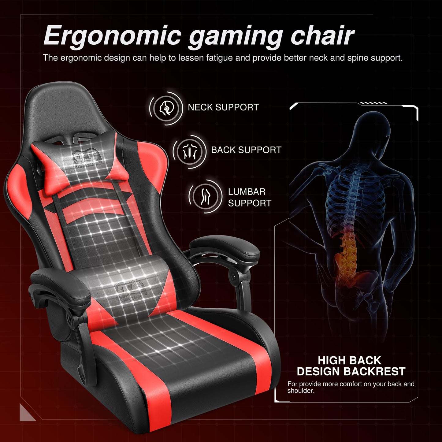- [Ergonomisches Design] Der Gaming Stuhl ist mit hochdichtem Schaumstoff gepolstert, um ein bequemes Sitzen zu ermöglichen, und verfügt über eine flexible Kopfstütze und Lendenkissen, um Nacken und Rücken zu stützen.