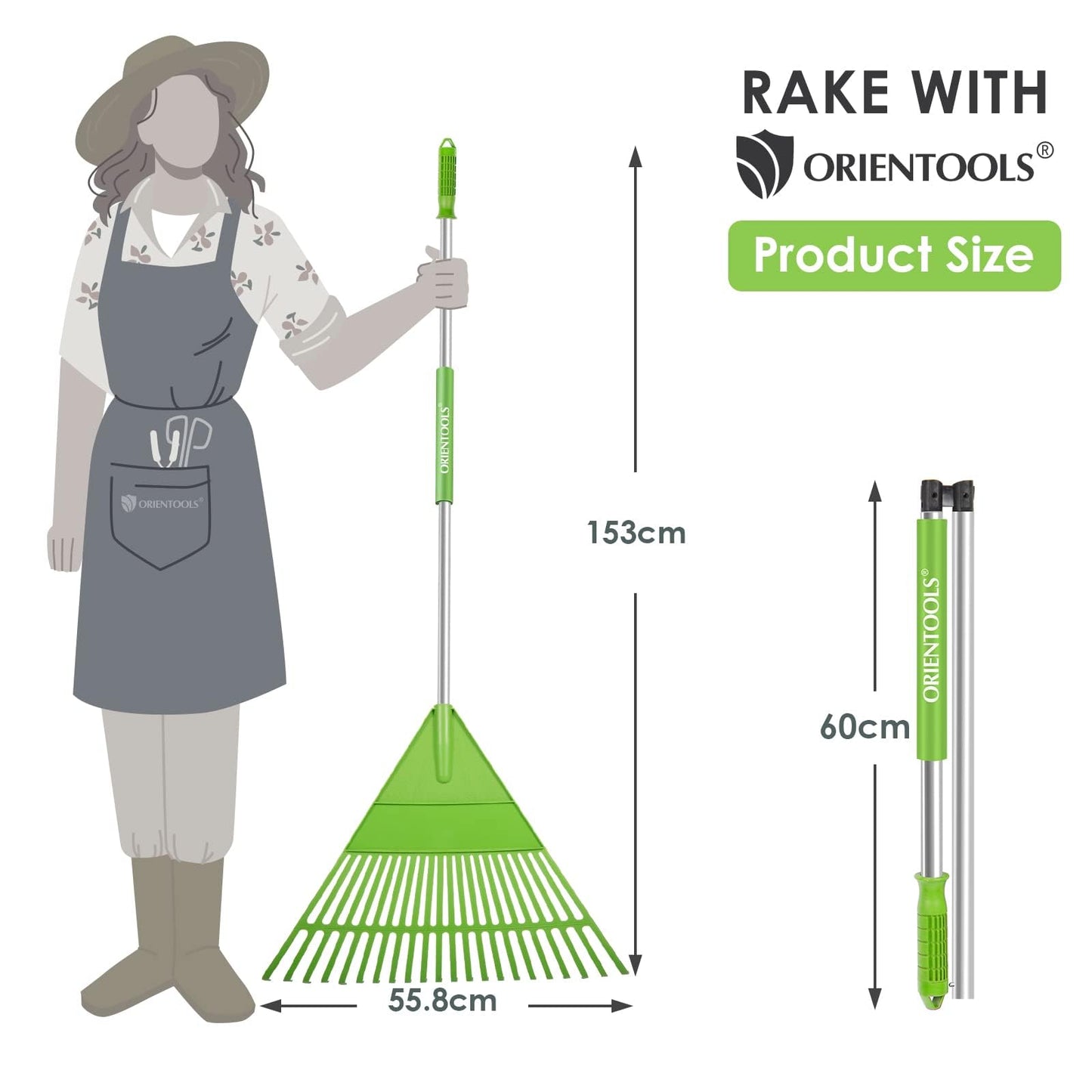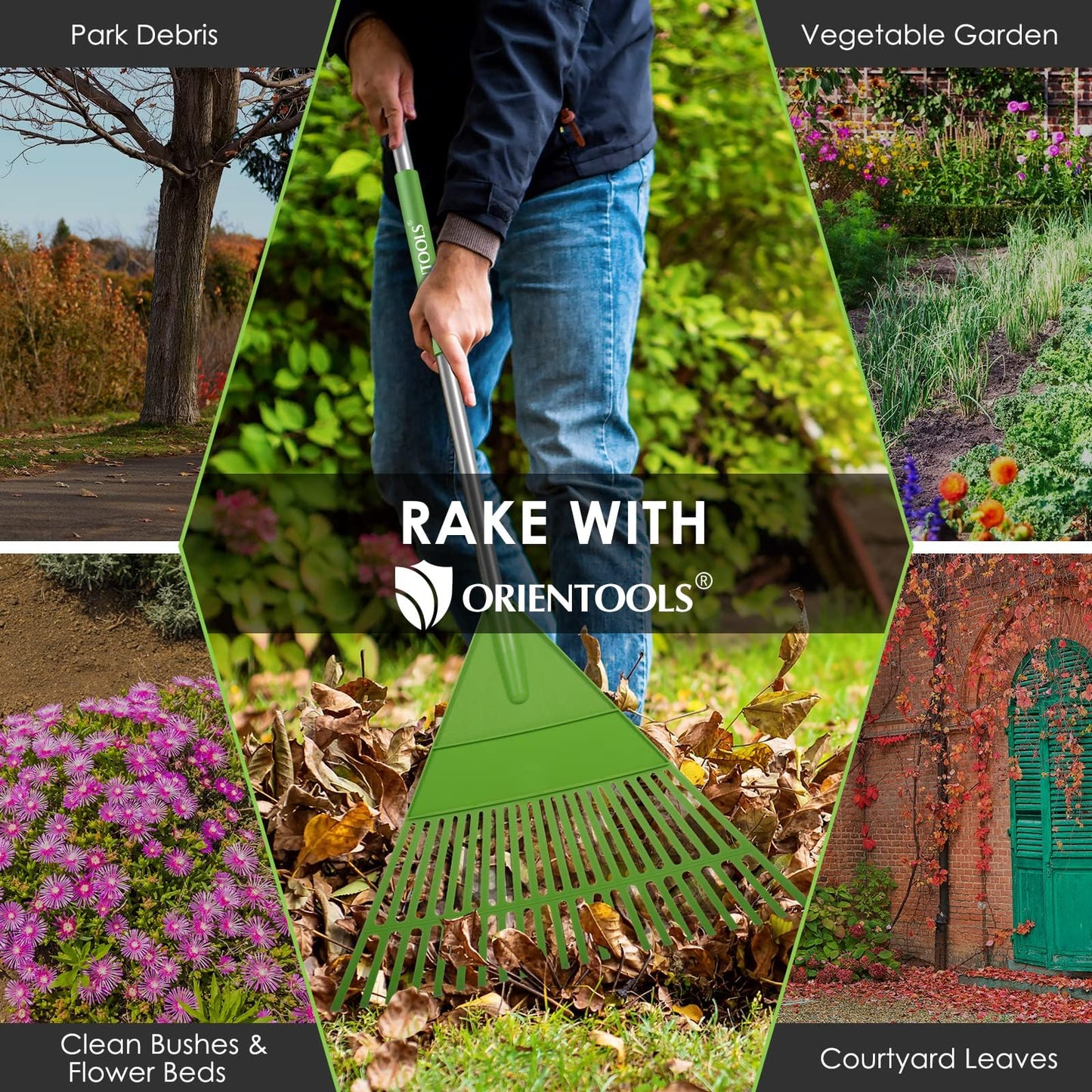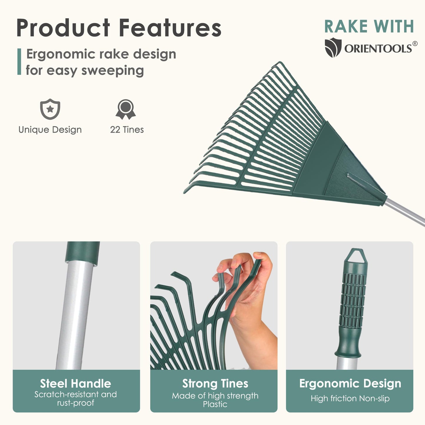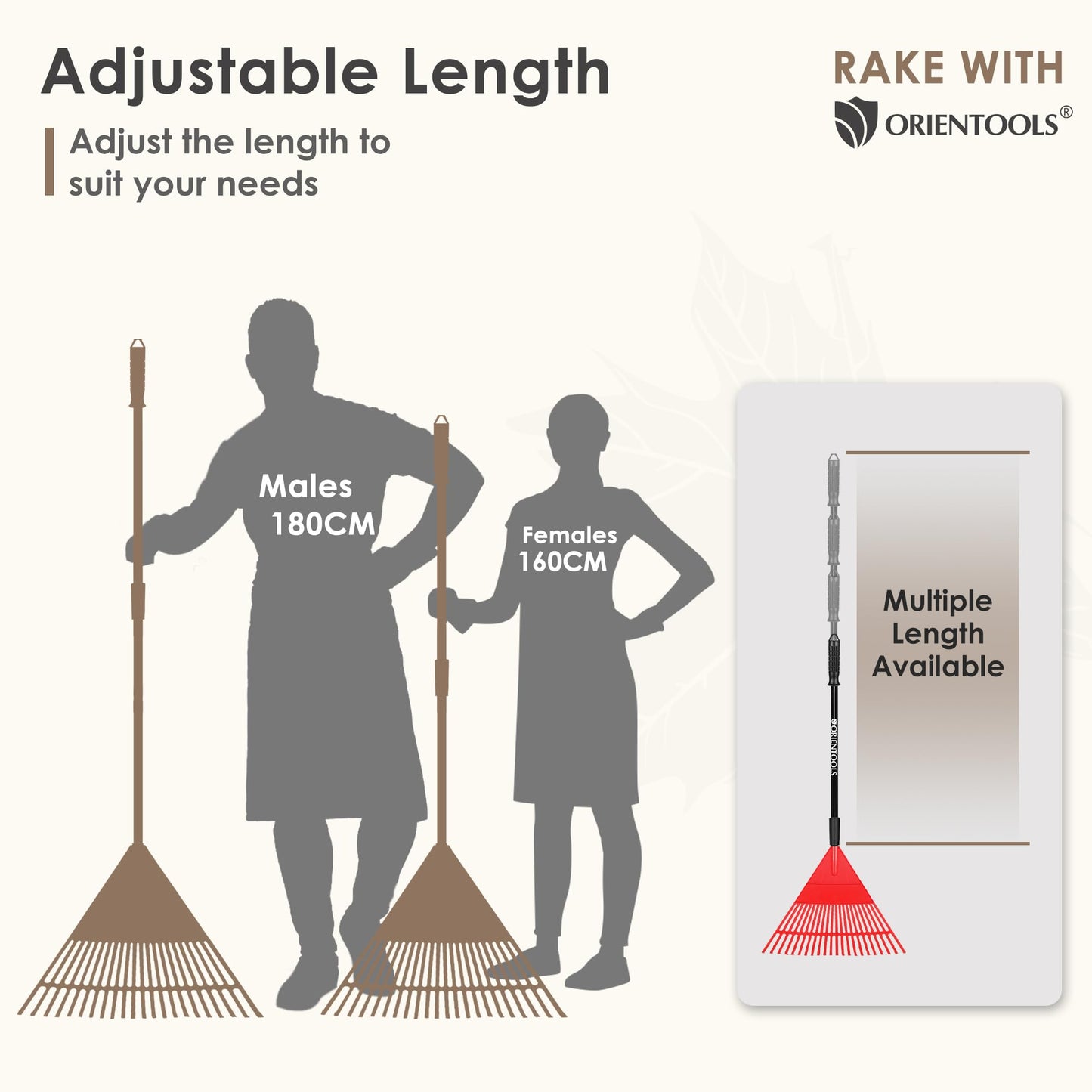 ORIENTOOLS Garten Laubrechen, Garten Rechen für Rasen Laub mit verstellbarem Griff 107 bis 156 cm Rechen, 22 Starke Zinken Kunststoff Kopf Strauch Rechen, Landschaftsbesen für Rasen und Blätter