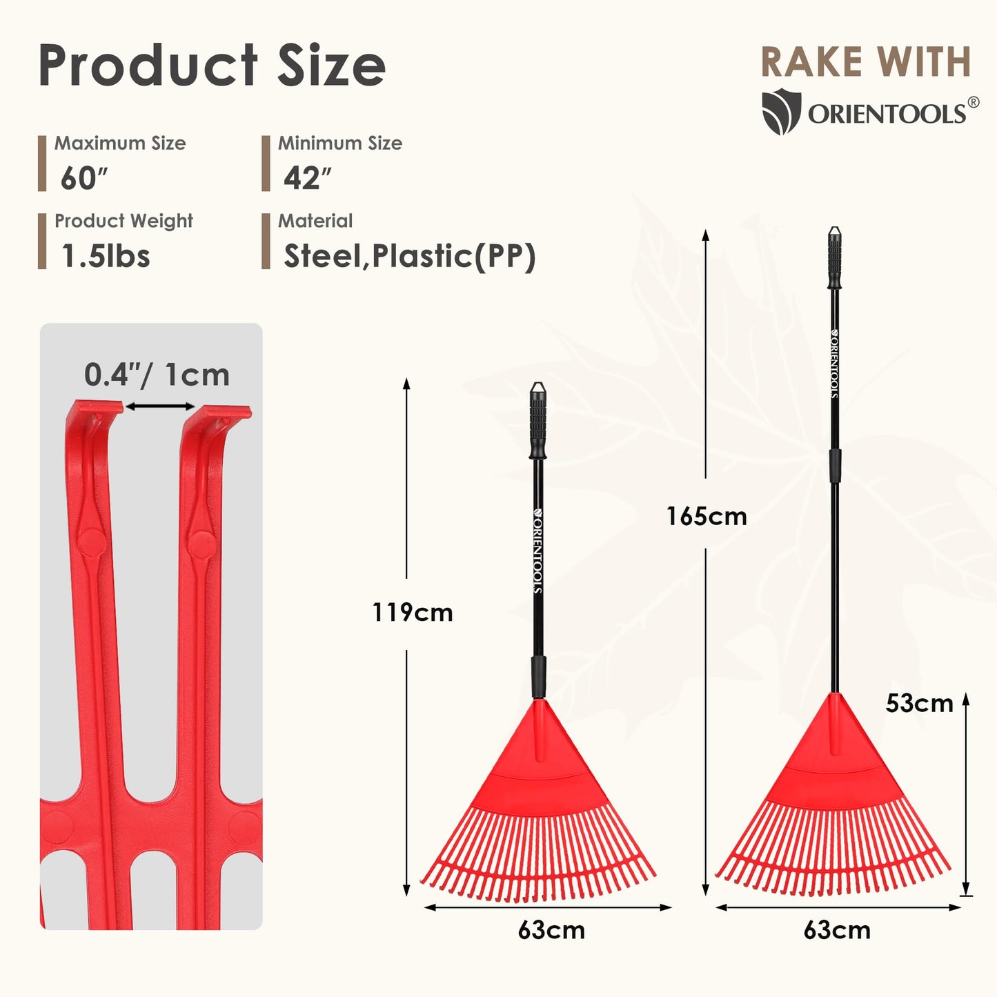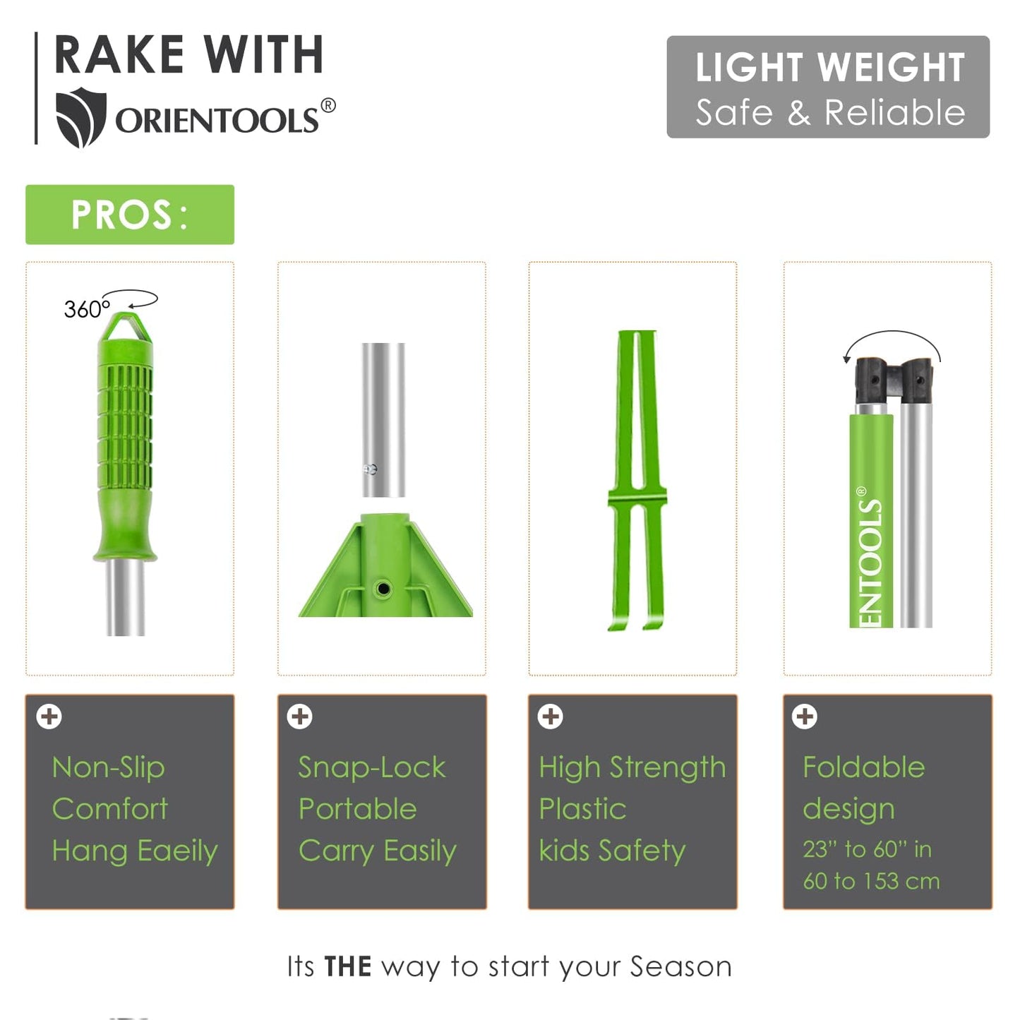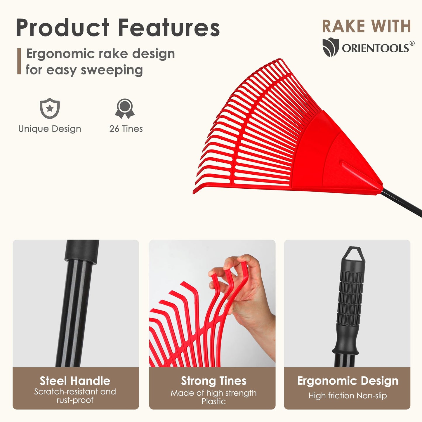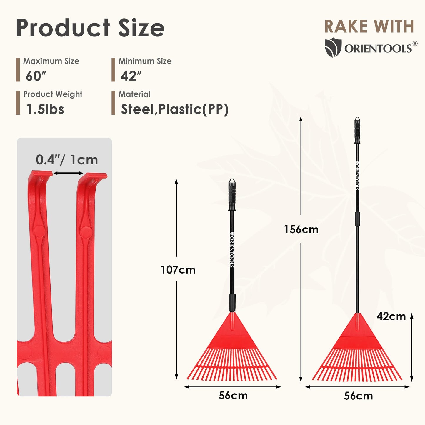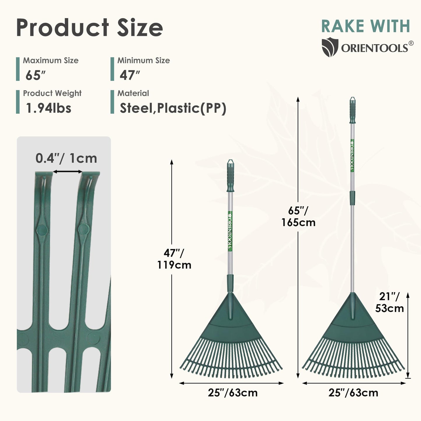 ORIENTOOLS Garten Laubrechen, Garten Rechen für Rasen Laub mit verstellbarem Griff 107 bis 156 cm Rechen, 22 Starke Zinken Kunststoff Kopf Strauch Rechen, Landschaftsbesen für Rasen und Blätter