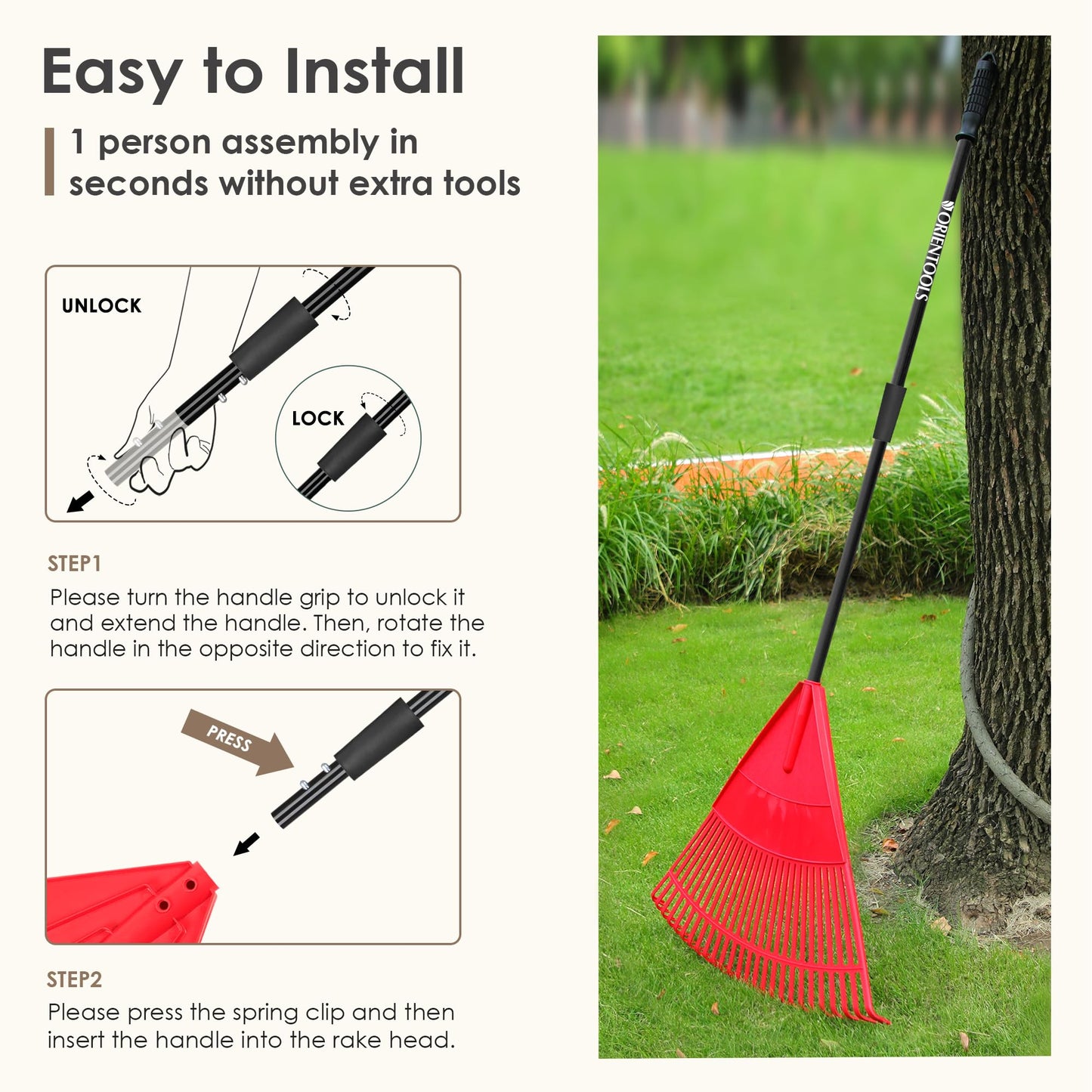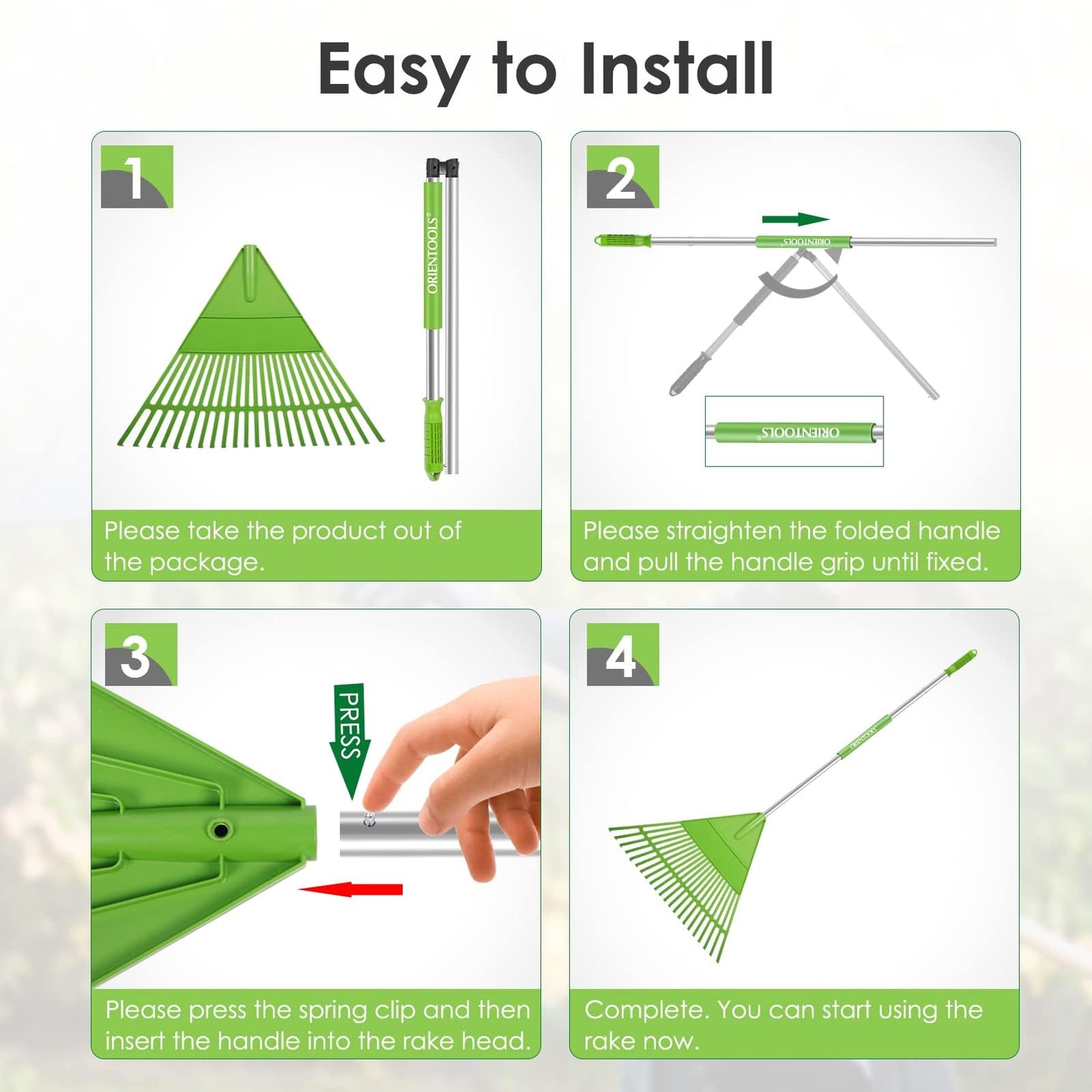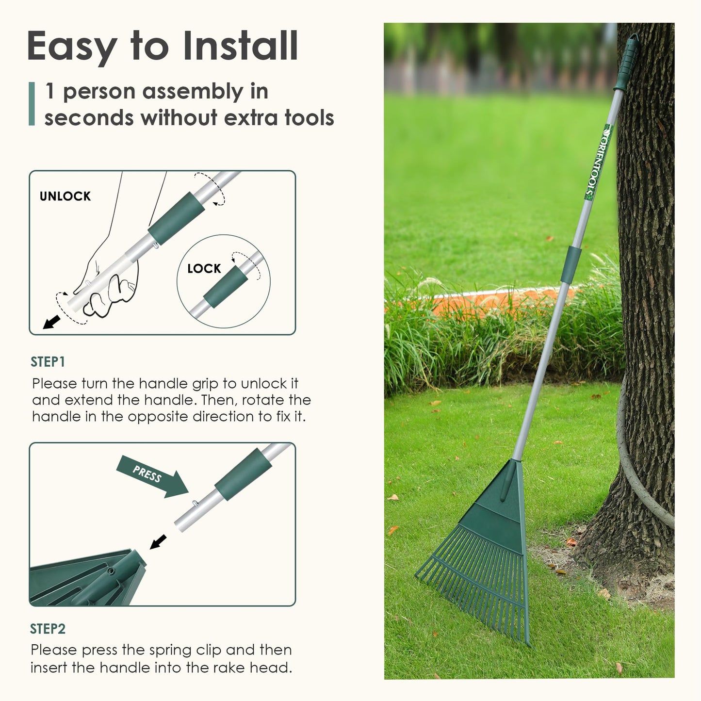 - EINBAU UND EINSTELLUNG: Die Installation wird durch Einsetzen des Verriegelungsknopfes am Stangenkopf in den Laubrechenkopf abgeschlossen. Halten Sie den Stangenkopf mit einer Hand und die andere Hand auf den Griff, drücken Sie im Uhrzeigersinn, um den Griff zu drehen, können Sie die Stiellänge von 107 bis 156 cm einstellen. Wenn Sie die Rechen nicht benutzen, kürzen Sie sie einfach auf ihre minimale Länge und hängen Sie sie überall in Ihrem Haus auf.