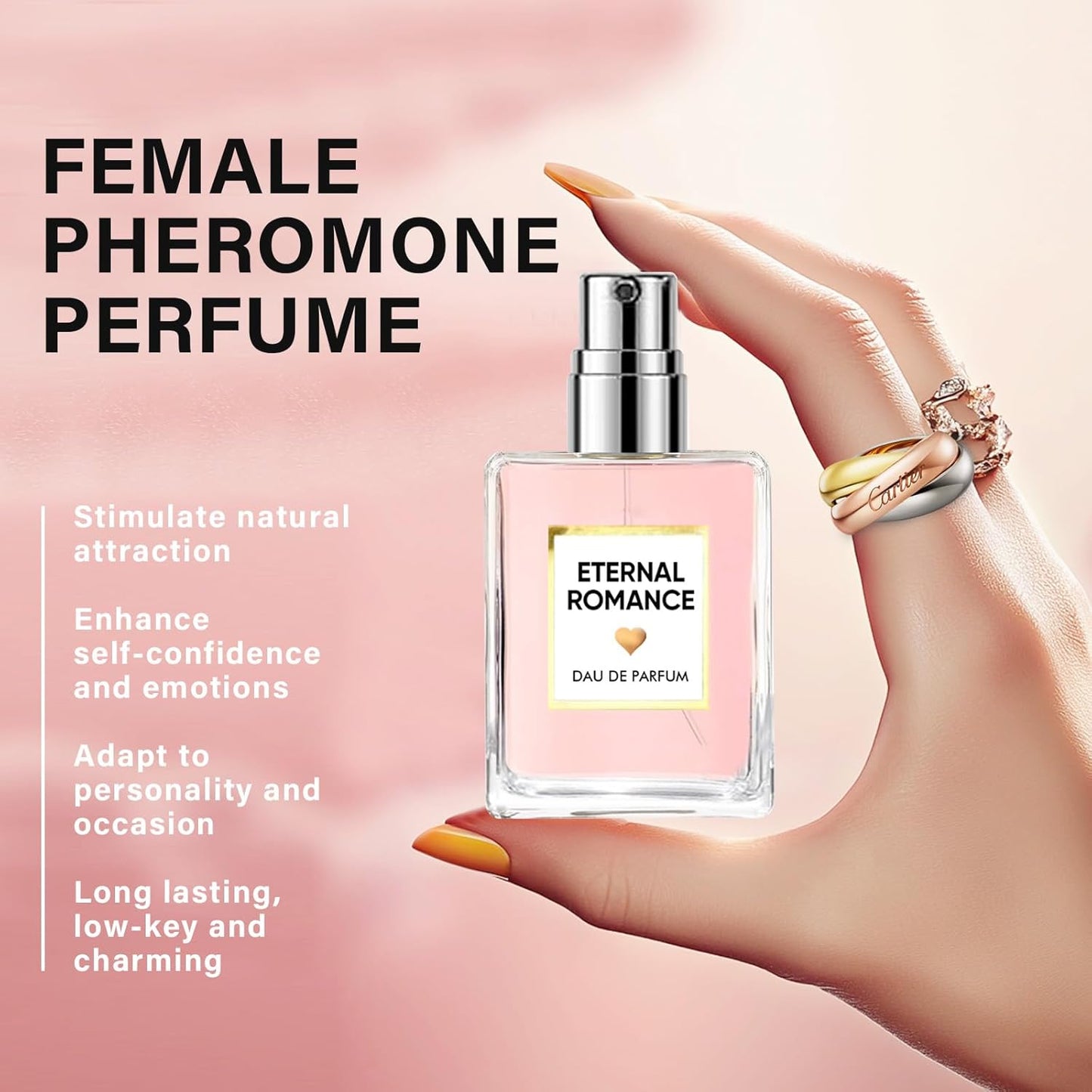 Unleash your inner confidence and allure with Pheromone Perfume for Women. Designed to enhance your natural charisma, this captivating fragrance is infused with pheromones, scientifically known to increase attraction and amplify your presence. Whether you're heading to an important event or enjoying a night out, this perfume boosts your charm, enthusiasm, and confidence, leaving a lasting impression wherever you go.