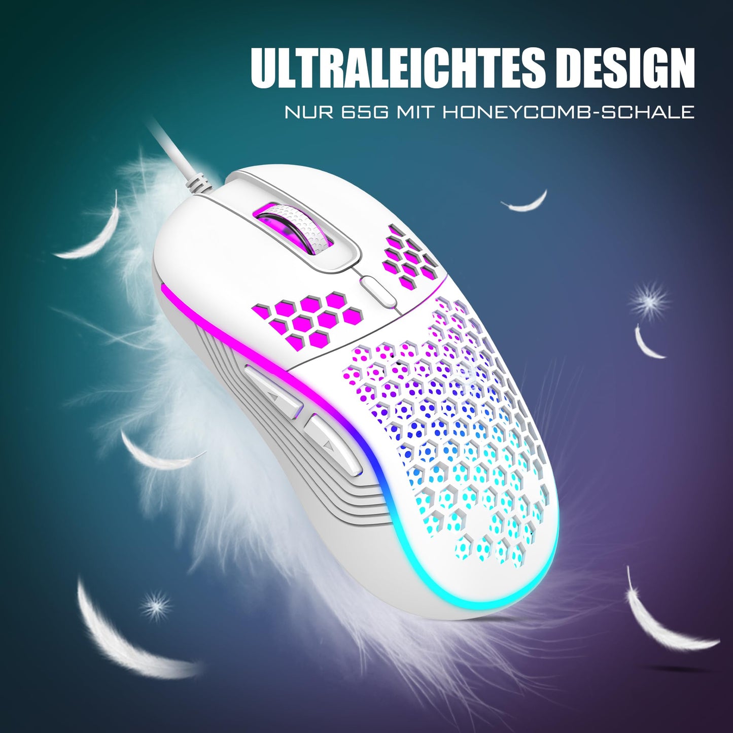 - 【Ultraleichte Wabenschale】 Gut gestaltete perforierte Wabenschale, die Maus kann bis zu 65 (+-5) Gramm wiegen, symmetrische Ergonomie, geeignet für linke oder rechte Hand und unterschiedliche Griffpositionen, flexibler und bequemer und wird es nicht Ermüdung.
