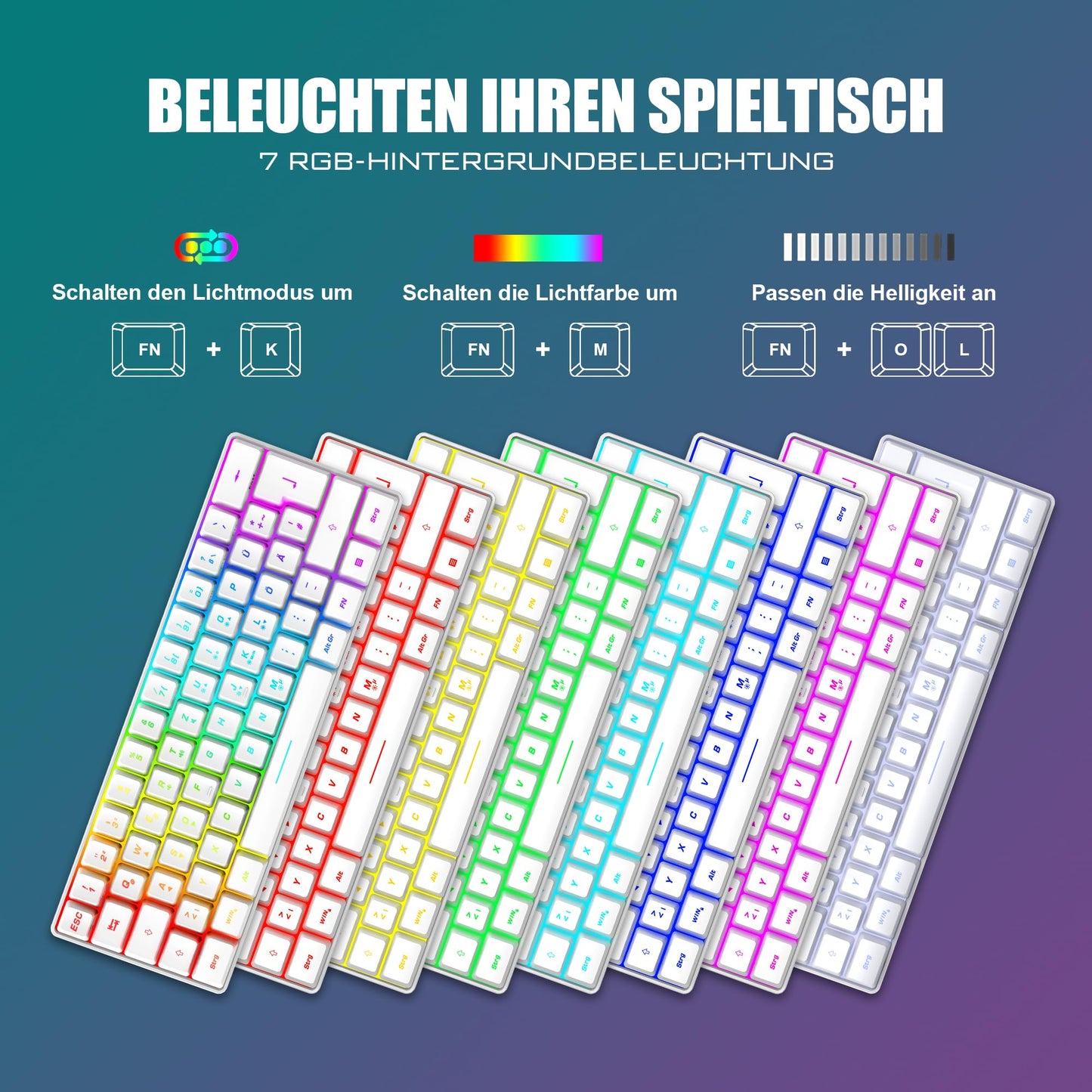 - 【RGB-Beleuchtete Gaming Tastatur】Eine Vielzahl von Lichtfarben und Lichtmodi zur Auswahl, veränderbarer Atmungs- oder permanenter Beleuchtungsmodus. Es kann großartig sein, das Spiel nachts auch ohne Licht zu spielen. Sie können auch die Helligkeit und Atemgeschwindigkeit der Hintergrundbeleuchtung nach Ihren Wünschen einstellen.