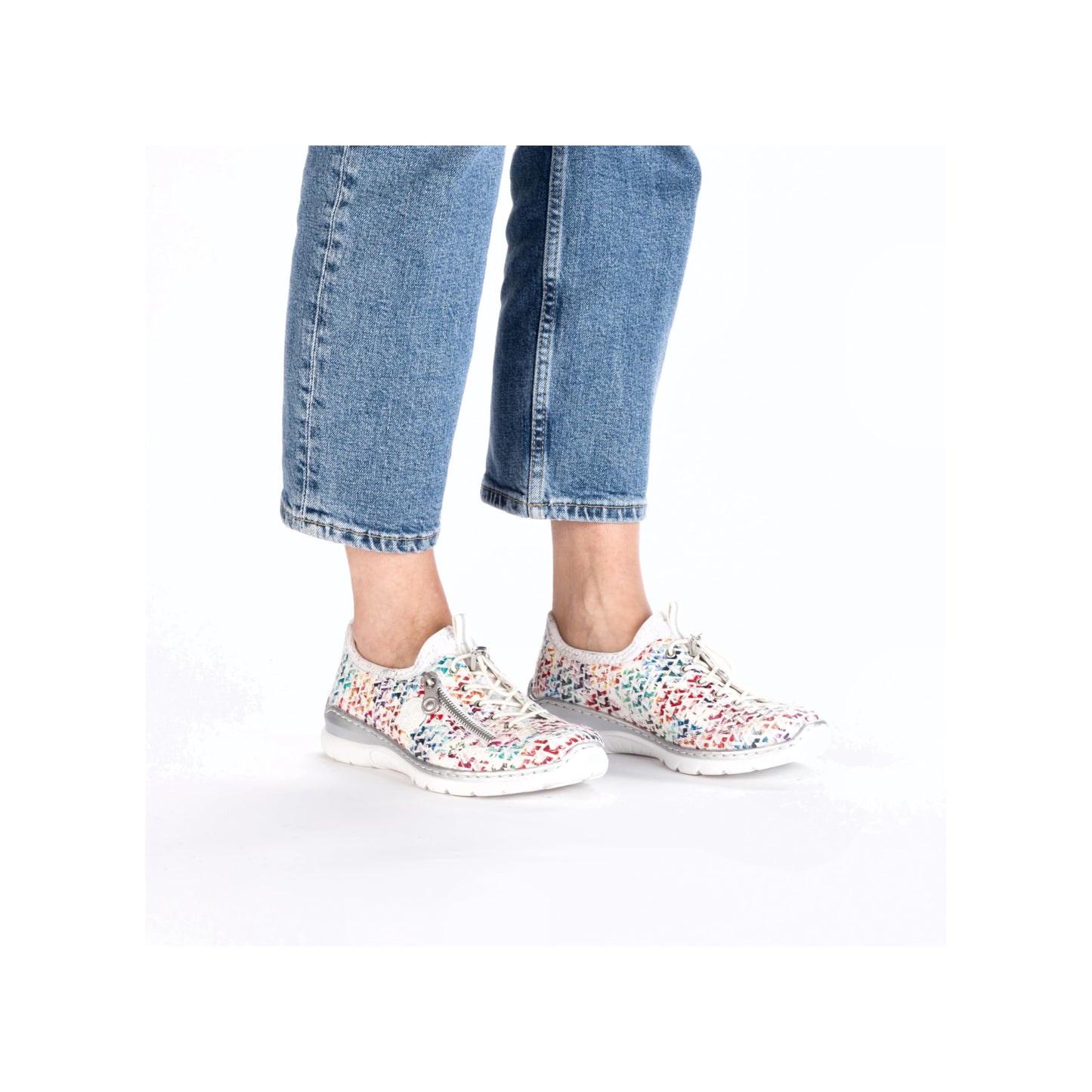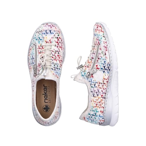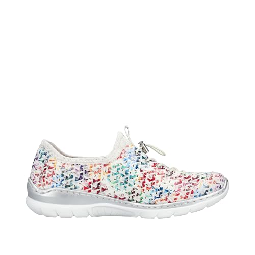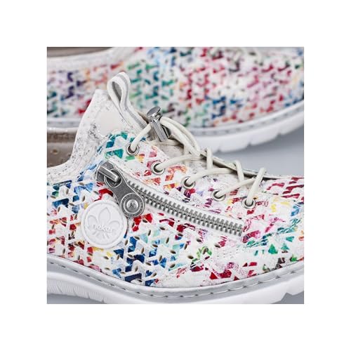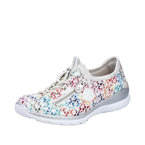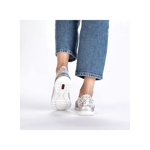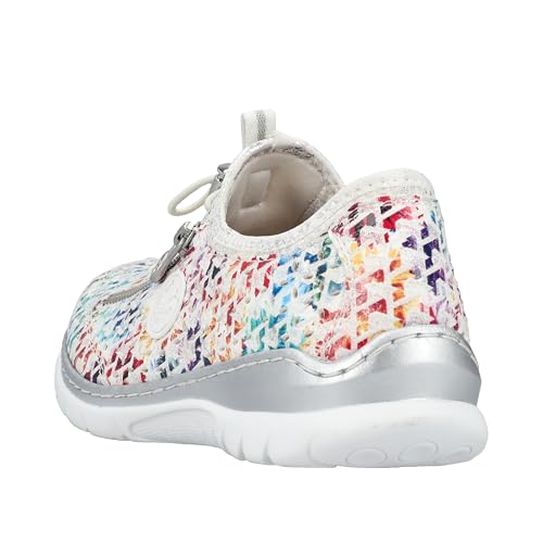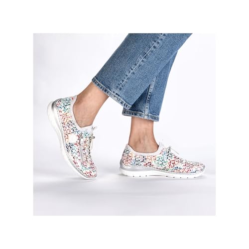 Experience the perfect blend of style and comfort with Rieker Women's L3252 Slippers. These multi-colored slip-ons feature a flexible and robust design with traditional stitching that ensures a perfect fit. The elastic band and flexible shaft edge make it easy to slip on, while the decorative zipper adds a touch of elegance. With a lightweight, shock-absorbing sole and wedge heel, these slippers provide all-day comfort. The extra-soft MemoSoft insole pampers your feet with every step. Slip on these slippers and enjoy ultimate comfort wherever you go.