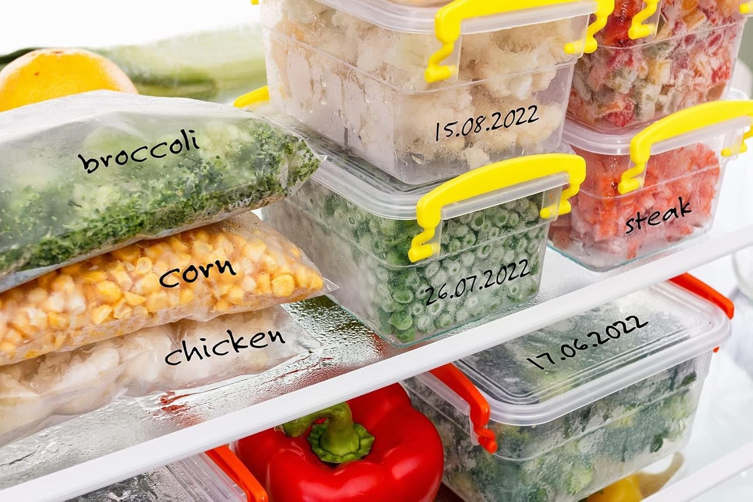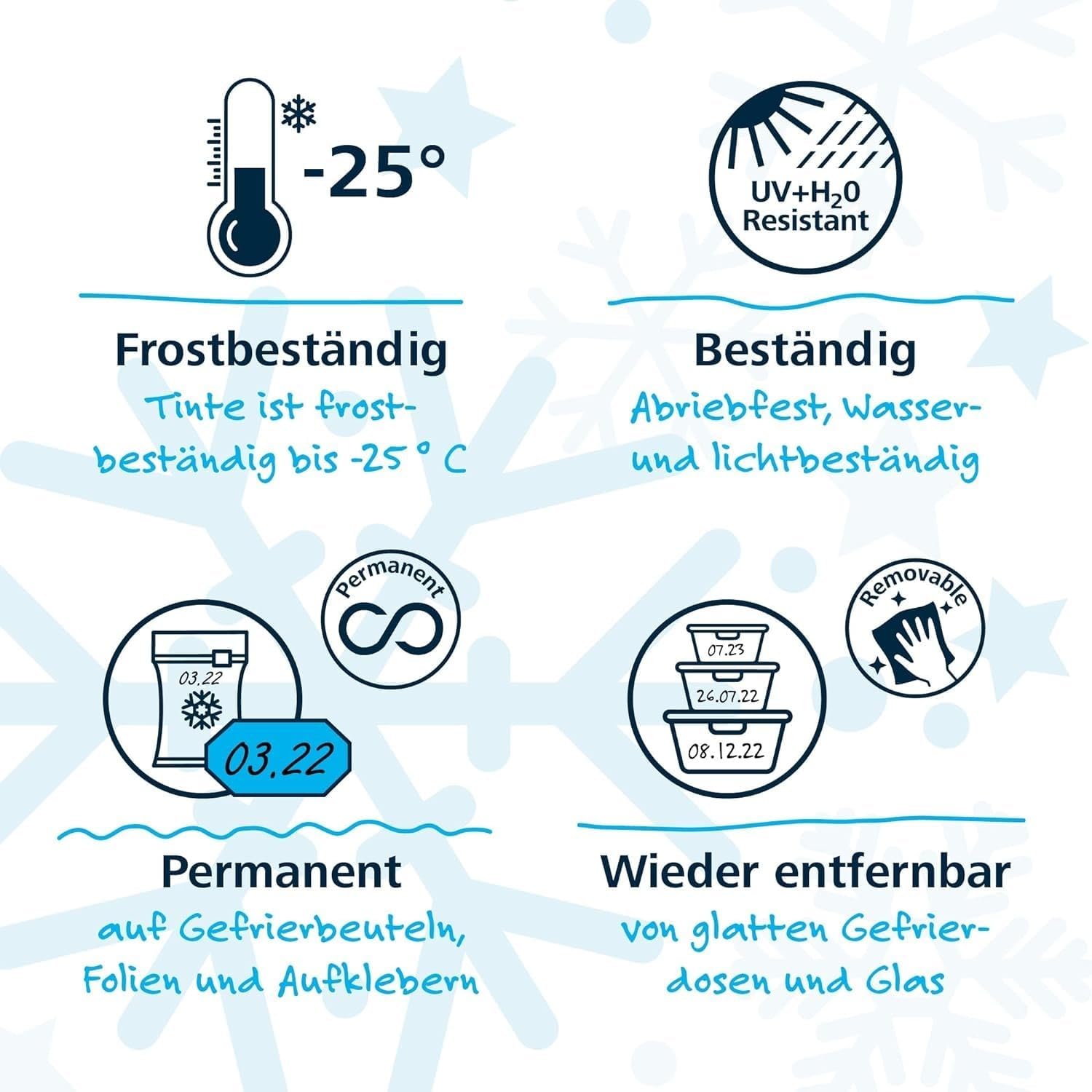 - Permanent auf Gefrierbeuteln, Folien und Aufklebern. Auf glatten Gefrierdosen und Glas ist die Tinte abwischbar