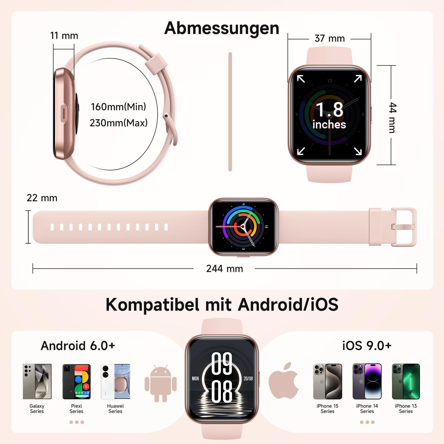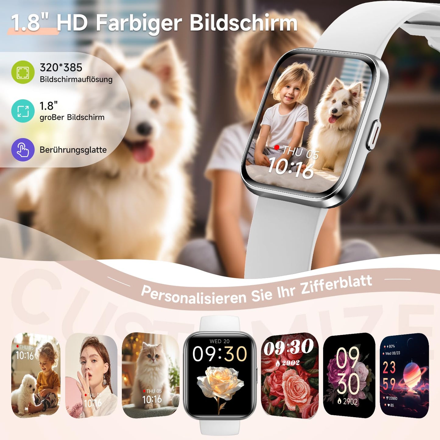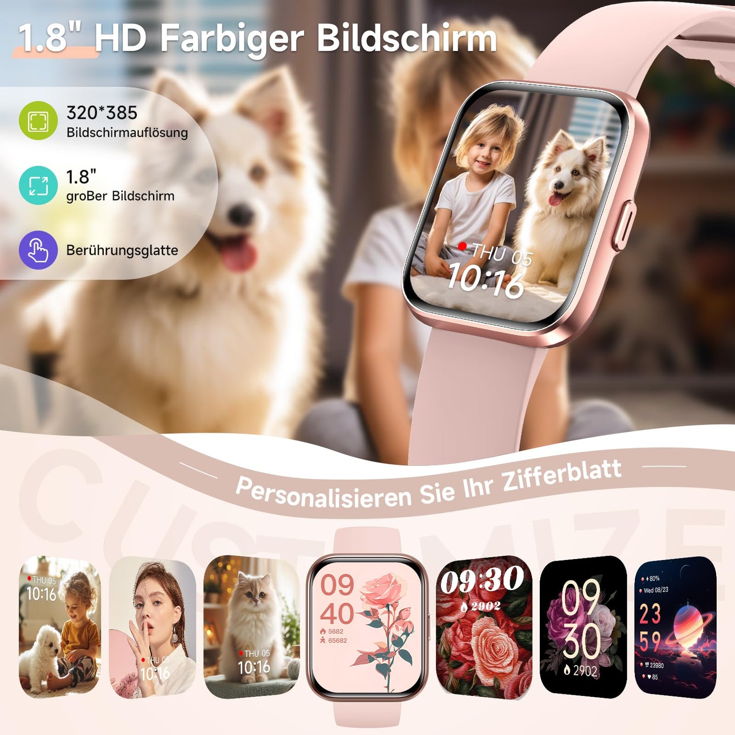 - 【1.8" HD-Bildschirm & Personalisierbare Zifferblätter】Die Armbanduhr Damen verfügt über einen 1.8" HD-Touchscreen mit hoher Empfindlichkeit, der Ihnen ein anderes visuelles Vergnügen bereitet. Drücken Sie Ihre Persönlichkeit mit 100+ kostenlosen Zifferblättern und vollständig anpassbaren Zifferblättern auf Ihre eigene.