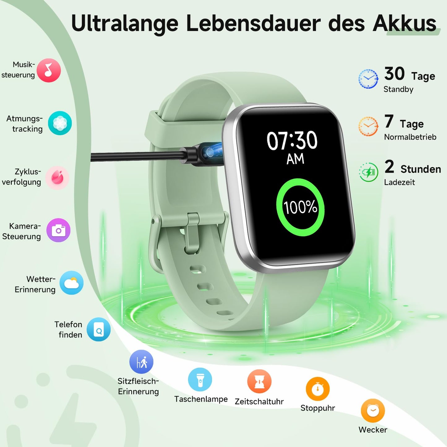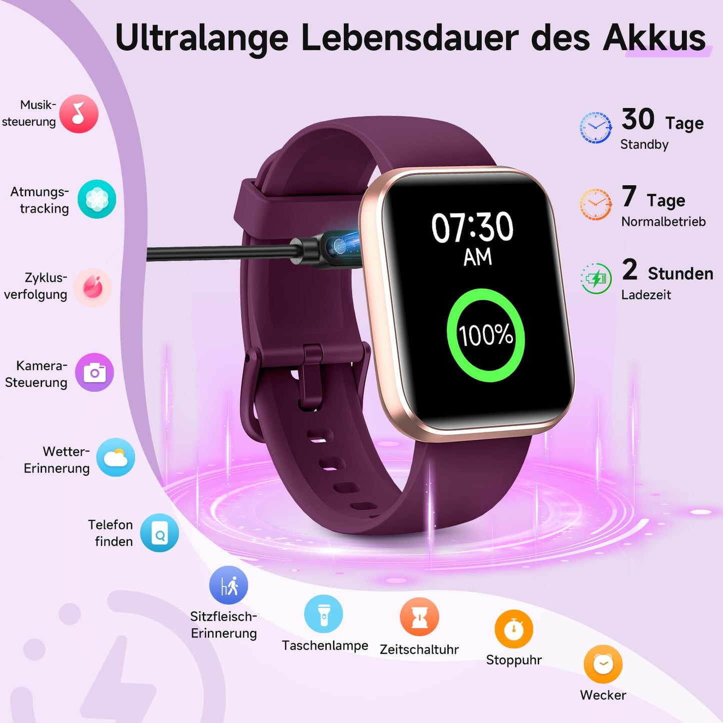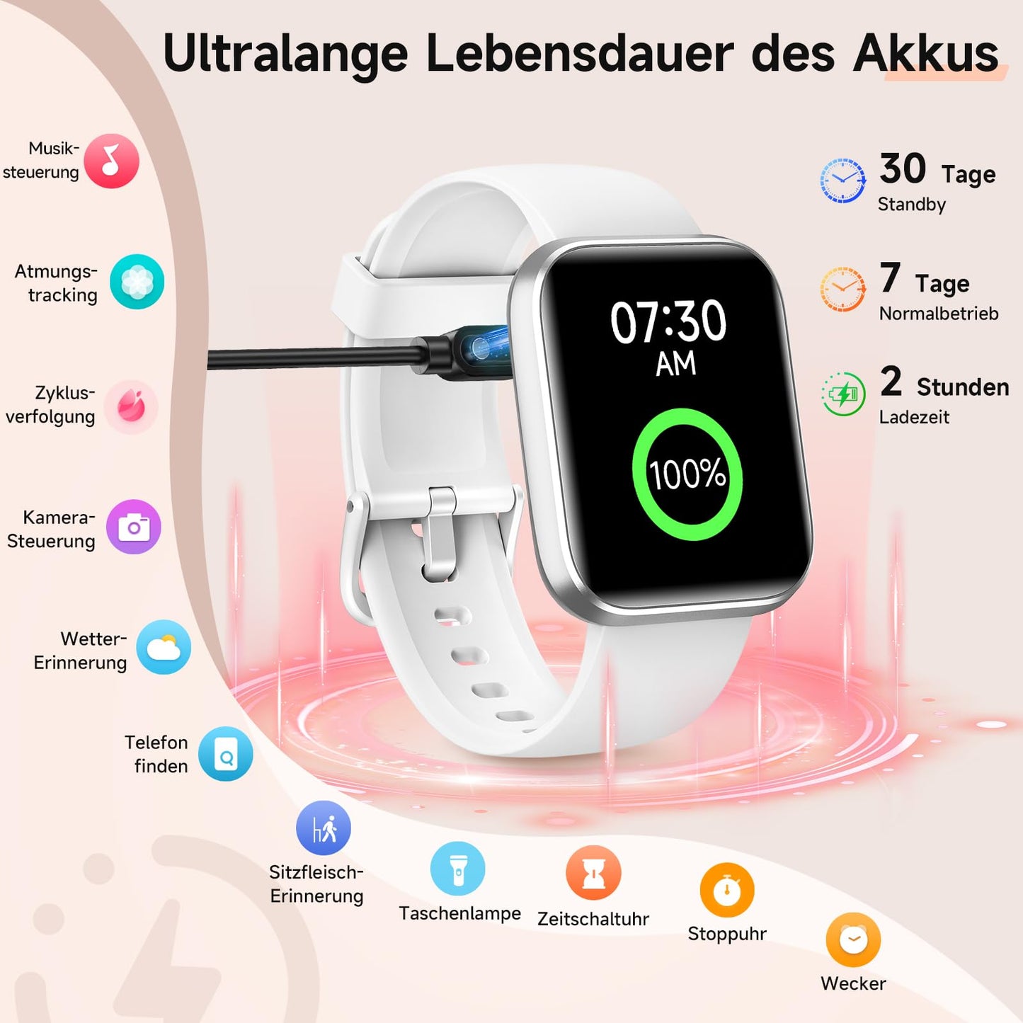 - 【Vielseitige Funktionen & hervorragende Akkulaufzeit】Die Damenuhr bietet eine Reihe weiterer Funktionen, einschließlich Wettervorhersagen, Erinnerung an sitzende Tätigkeiten, Taschenlampe, Musik- und Kamerasteuerung, Bewegungserkennung, Alarme, Stoppuhr, Timer, Atemführer, Aufstehen zum Wecken und mehr. Mit einer kurzen Ladezeit von 2 Stunden bietet die Smartwatch eine bemerkenswerte Akkulaufzeit von 7 Tagen bei normaler Nutzung und bis zu 30 Tagen Standby-Zeit.