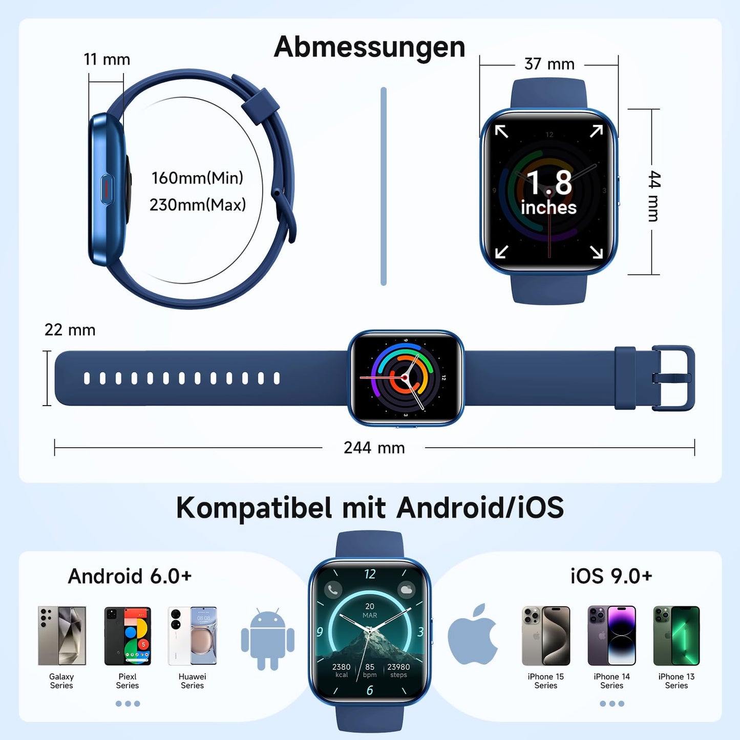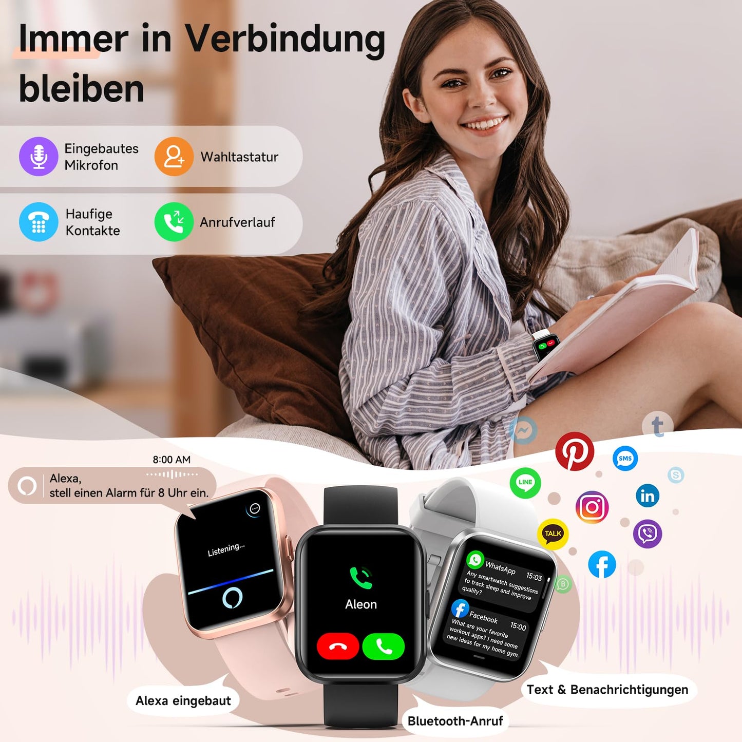 - 【Bluetooth-Anrufe & Alexa Integriert】Mit Bluetooth 5.3 können Sie mit dieser Smart Watch unterwegs Anrufe tätigen/beantworten/ablehnen. Erhalten Sie außerdem Benachrichtigungen von Ihrem Smartphone auf Ihrem Handgelenk, wie Facebook, Instagram und mehr. Funktioniert mit Amazon Alexa, befehlen Sie Ihrem Gerät, einen Alarm zu stellen, Musik zu steuern oder die neueste Wettervorhersage mit einem einfachen Sprachbefehl zu erhalten, indem Sie mit Ihrer Uhr sprechen. (Hinweis: DIE UHR KANN KEINE NACHRICHTEN SENDEN, oder TEXT ZURÜCK).
