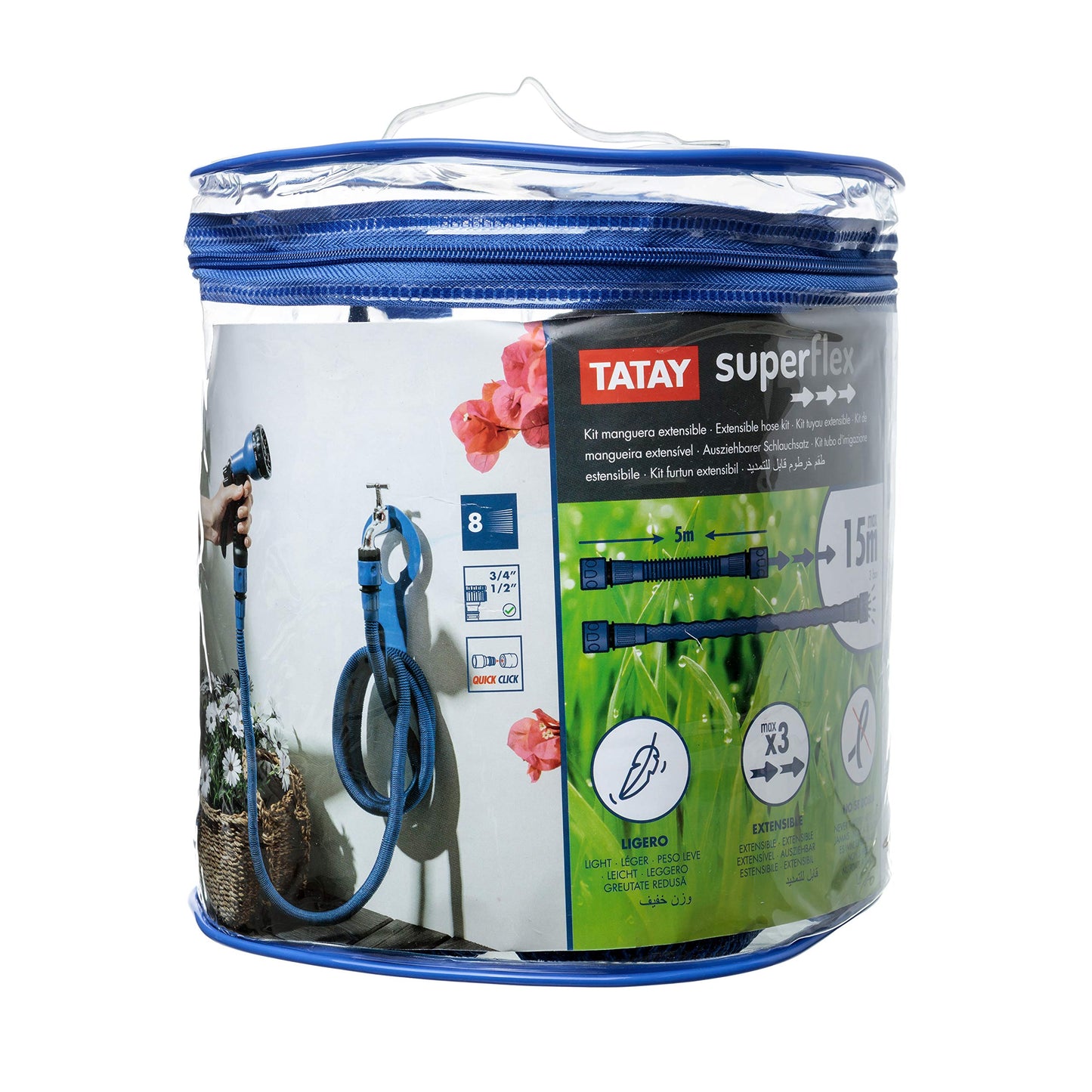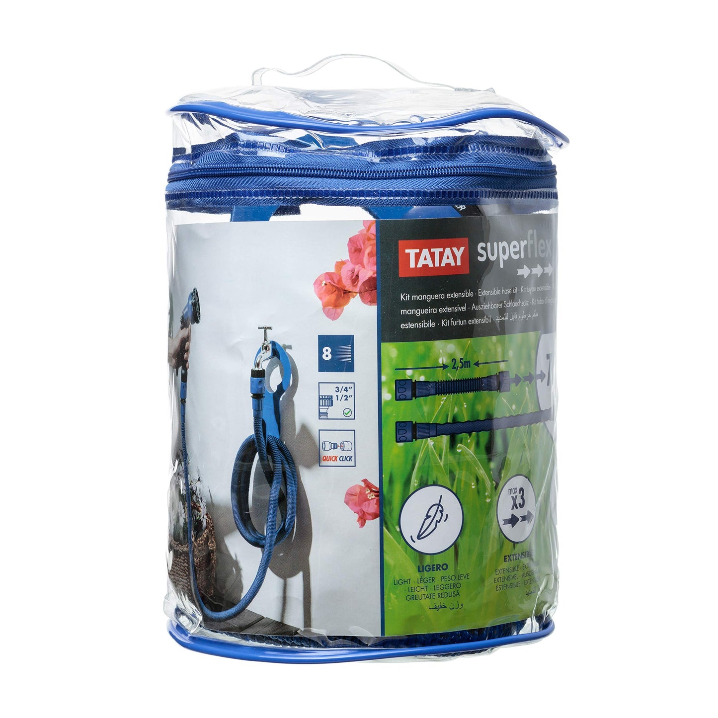 TATAY Gartenschlauch Flexibel 7,5 m Superflex, leicht, Bewässerungspistole mit 8 Positionen, Universalanschluss, 3/4"-1/2" Innengewinde und Aufhänger. Blau