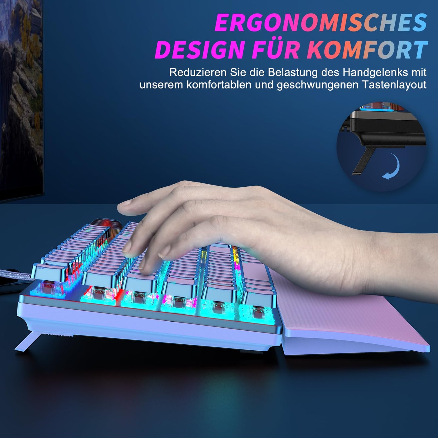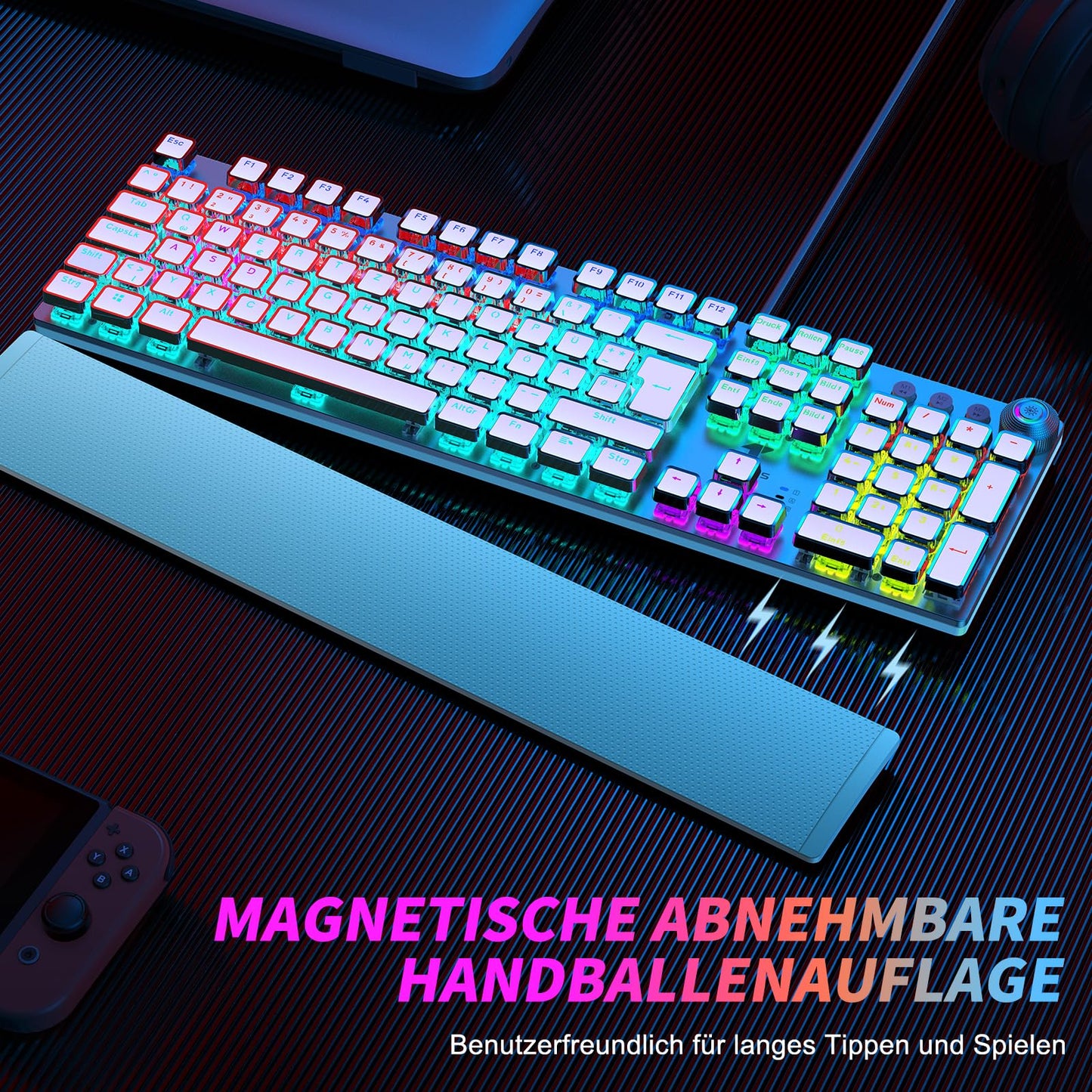 - Ergonomische Mechanische Tastatur mit Handgelenkauflage: Diese gaming-tastaturen für pc bietet zwei einstellbare Winkel von 6º/15º, die eine wissenschaftlich gestaltete gestufte Tastenkappenanordnung ermöglichen. Eine magnetische Handgelenkauflage hält Ihre Hände in der natürlichen Position und minimiert Ermüdungserscheinungen bei längerem Gebrauch