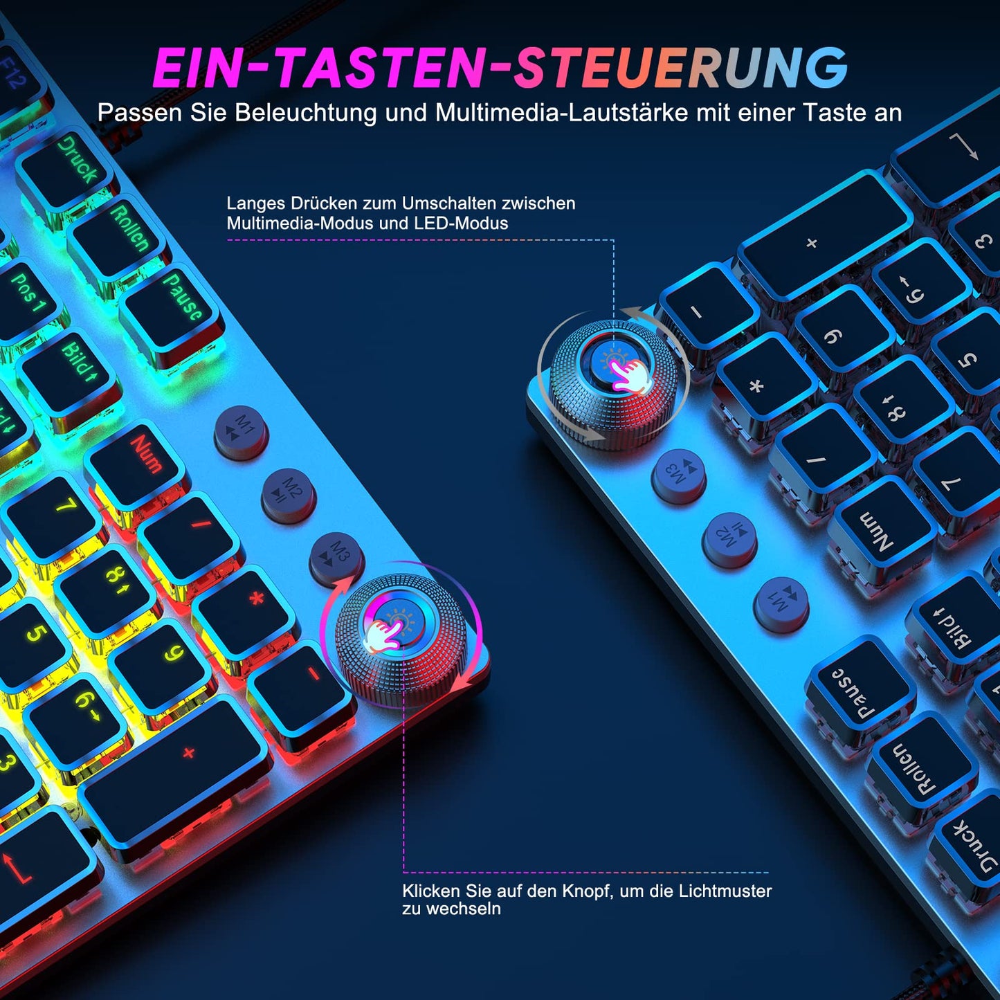 - Multimedia & coole Beleuchtung: Diese tastatur gaming verfügt über 19 coole Beleuchtungsmodi, die mithilfe eines Drehknopfs leicht eingestellt werden können, um den Beleuchtungsmodus und die Lautstärke zu steuern. Die gaming keyboard enthält auch praktische Multimedia-Tasten, mit denen Sie Ihren Computer mühelos für Arbeit oder Spiele steuern können