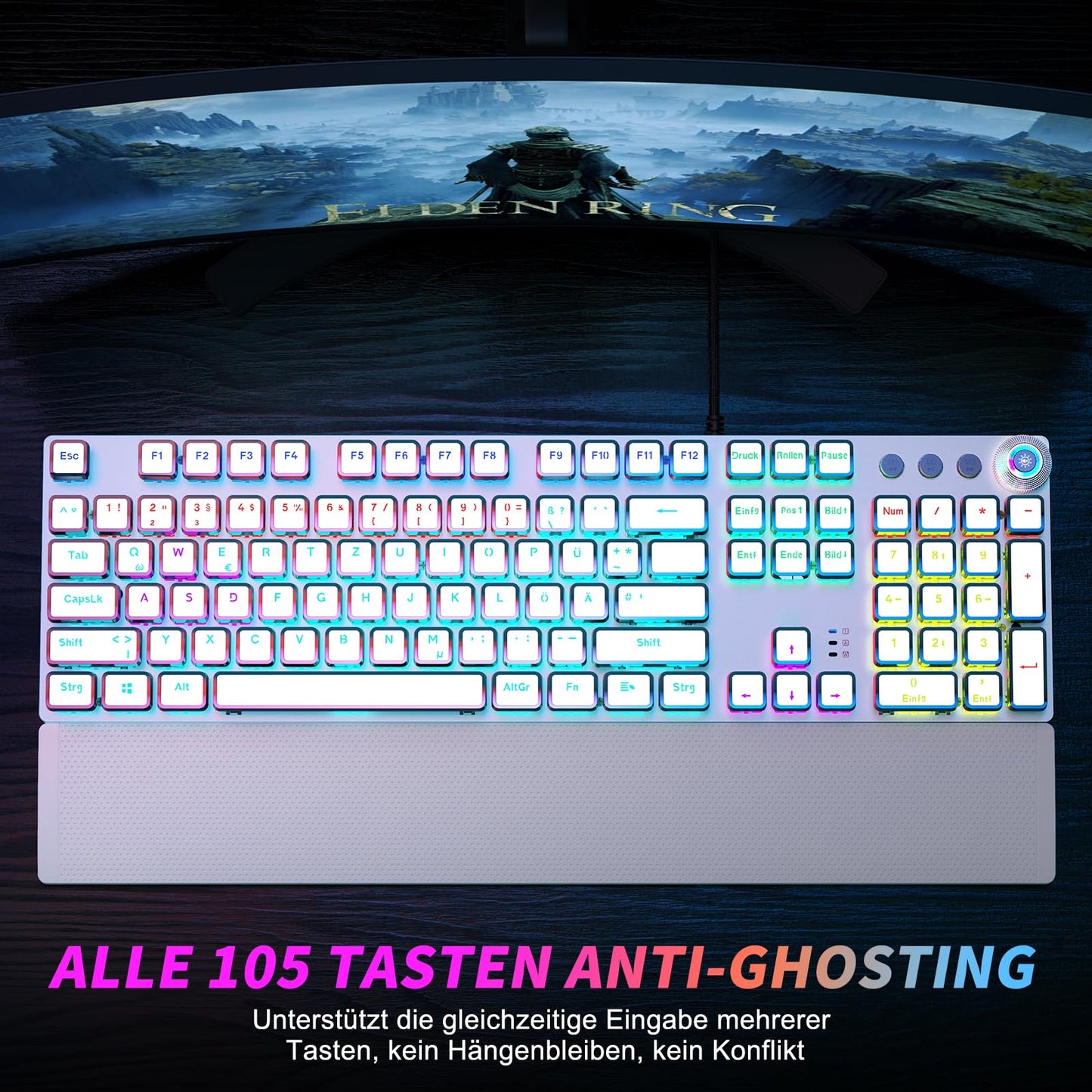 TECURS Mechanische Gaming Tastatur - QWERTZ Mechanical Keyboard mit Magnetische Handgelenkauflage, Multimedia-Tasten, 105 Tasten Kabelgebundene Rote Schalter Tastatur für PC/PS5/PS4, 19 LED Modi
