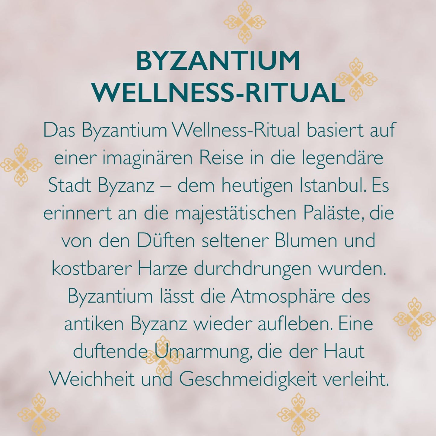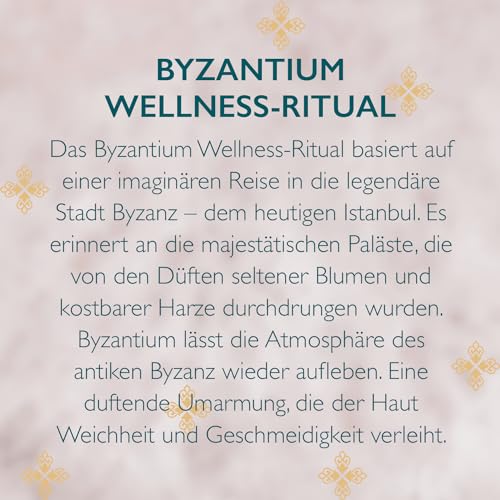 Entfliehe dem Alltag und begib dich auf eine Reise in die zauberhafte Welt des Orients! Der Byzantium-Duft für Damen ist inspiriert von einer imaginären Reise in die antike Stadt Byzanz, dessen majestätische, goldene Paläste von himmlischen Düften seltener Blumen und kostbarer Harze durchdrungen wurden. Die verführerische Komposition aus Zimt, Mandel und Mimose in der Kopfnote wird dich verzaubern. In der zweiten Phase, der Herznote, kommen schwarze Rose, Honig und Heliotrop hinzu, die die Sinne betören. Die dritte Phase, die Basisnote, rundet das Dufterlebnis mit Vanille, weißem Moschus, Holz und Kakao perfekt ab und hinterlässt einen unvergesslichen Eindruck. Mit seiner edlen Optik und dem traumhaften Duft ist das EDT zudem nicht nur ein echtes Highlight im eigenen Zuhause, sondern auch eine schöne Geschenkidee, um die Liebsten gedanklich in den Orient verreisen zu lassen.