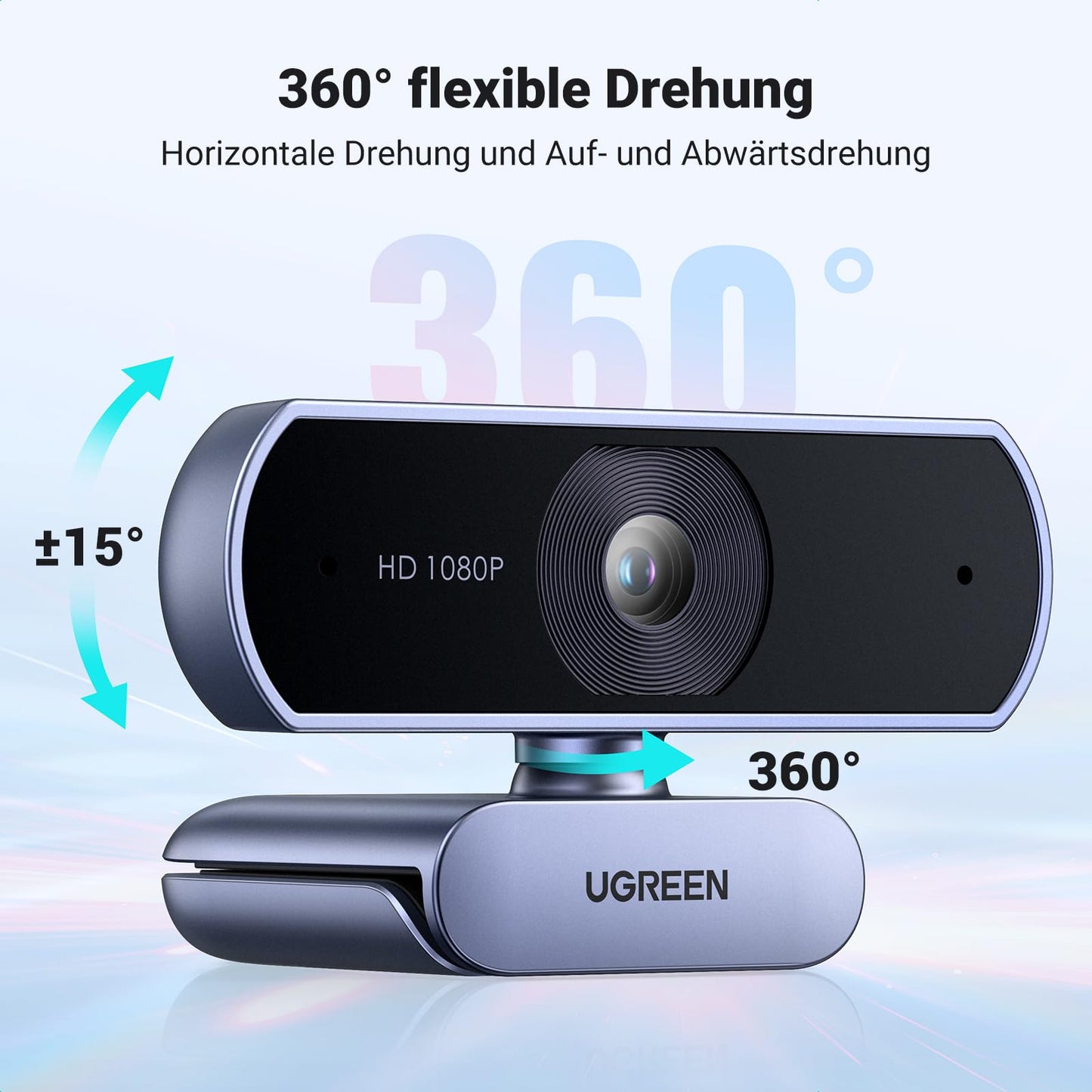 UGREEN Webcam Full HD 1080P/30fps USB Webcam für PC, Webcam mit Mikrofon, klares Stereo-Audio, automatische Lichtkorrektur, 85° Ansicht, USB Webcam für Live Streaming, Videoanrufe, Lernen, Konferenzen