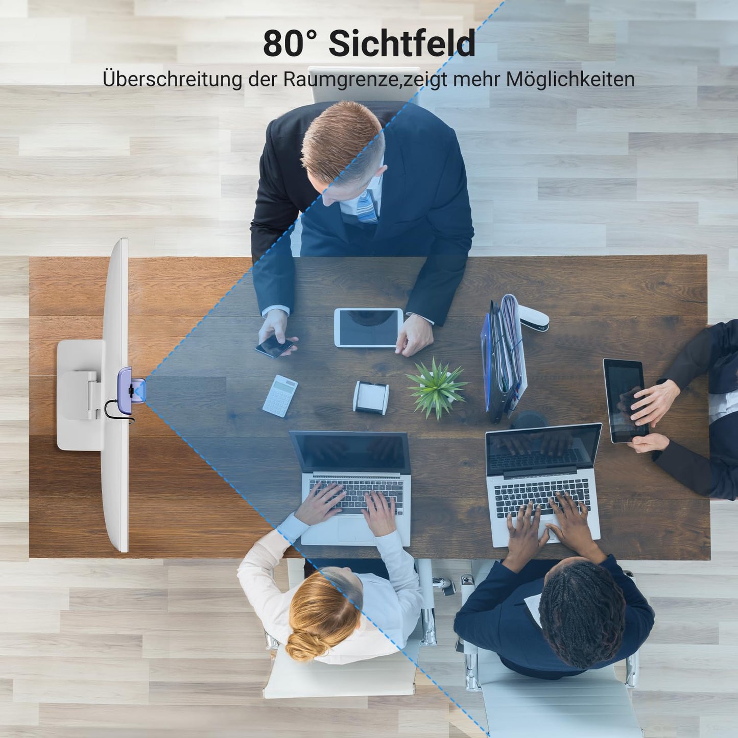 - 360° Drehung und 85° Weitwinkelansicht: Diese Webcam für PC unterstützt eine Rundumdrehung um 360° und eine Mehrwinkeleinstellung um 15° nach oben und unten, damit Sie den perfekten Betrachtungswinkel finden. Das 85° Weitwinkelobjektiv erfasst einen größeren Kamerabereich, sodass mehrere Personen teilnehmen können und Ihr Konferenzvideo für mehrere Personen reibungslos läuft.