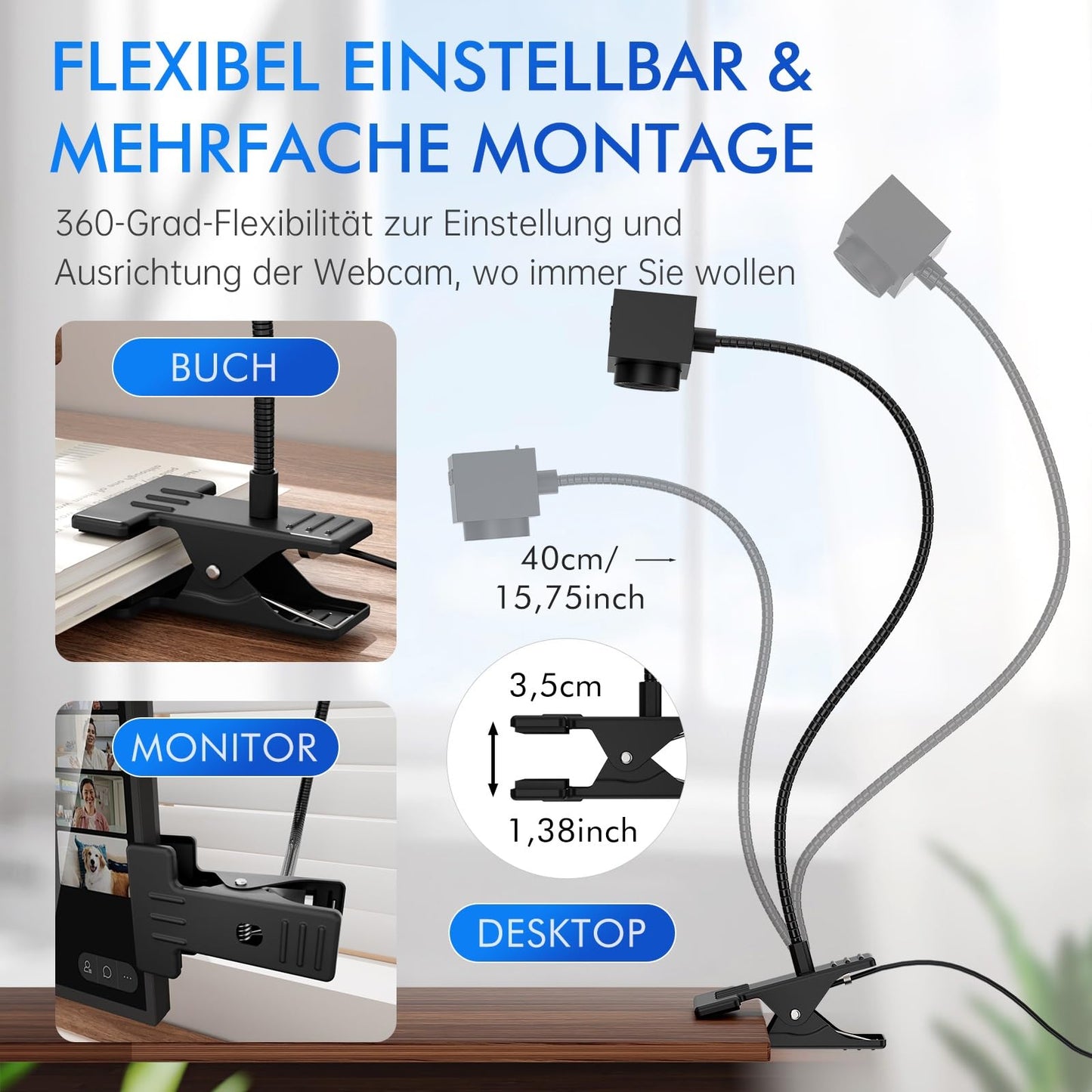 - 【Flexible Positionierung und Winkelanpassung】Dank des verstellbaren Schwanenhalses und der stabilen Klemme kann die PC-Kamera Webcam an verschiedenen Orten befestigt werden: auf Schreibtischen, Monitoren oder Sideboards (max. Dicke 3,5 cm). Sie eignet sich hervorragend für das Erfassen von Desktop-Dateien oder handgezeichneten Skizzen und ermöglicht flexible Winkelanpassungen für optimalen Komfort.