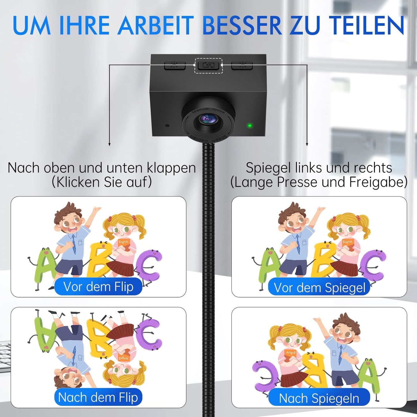 - 【Dokumenten-Webcam mit Bild- und Spiegelmodus】Mit der Bildumkehr- und Spiegelfunktion dieser Webcam können Sie Inhalte wie Manuskripte oder Desktop-Dateien effizient präsentieren. Oben, unten, links oder rechts – die Bildausgabe lässt sich über die Taste frei umkehren, um Ihre Arbeit besser zu teilen. Perfekt für Online-Unterricht, Präsentationen und kreative Anwendungen.