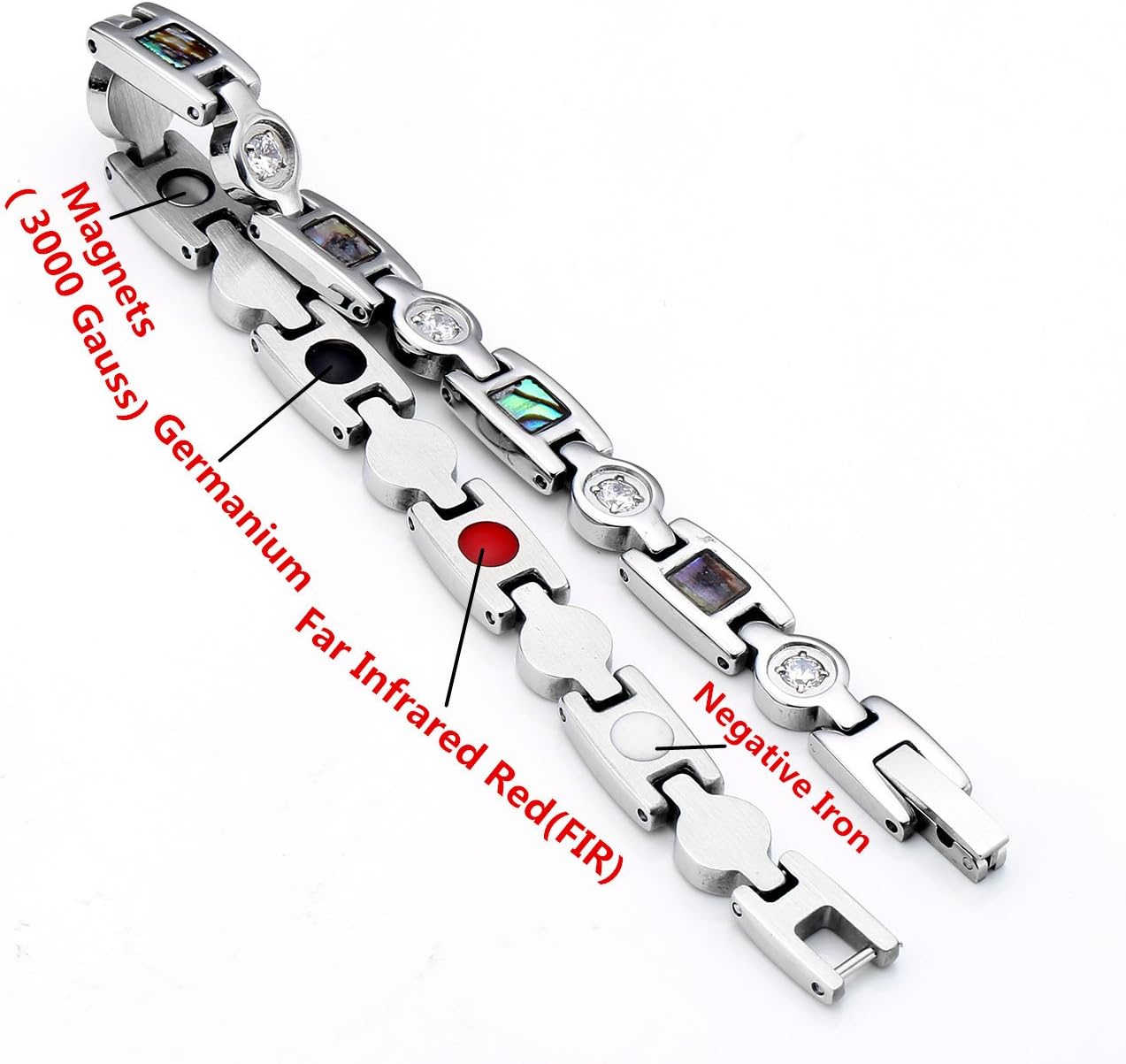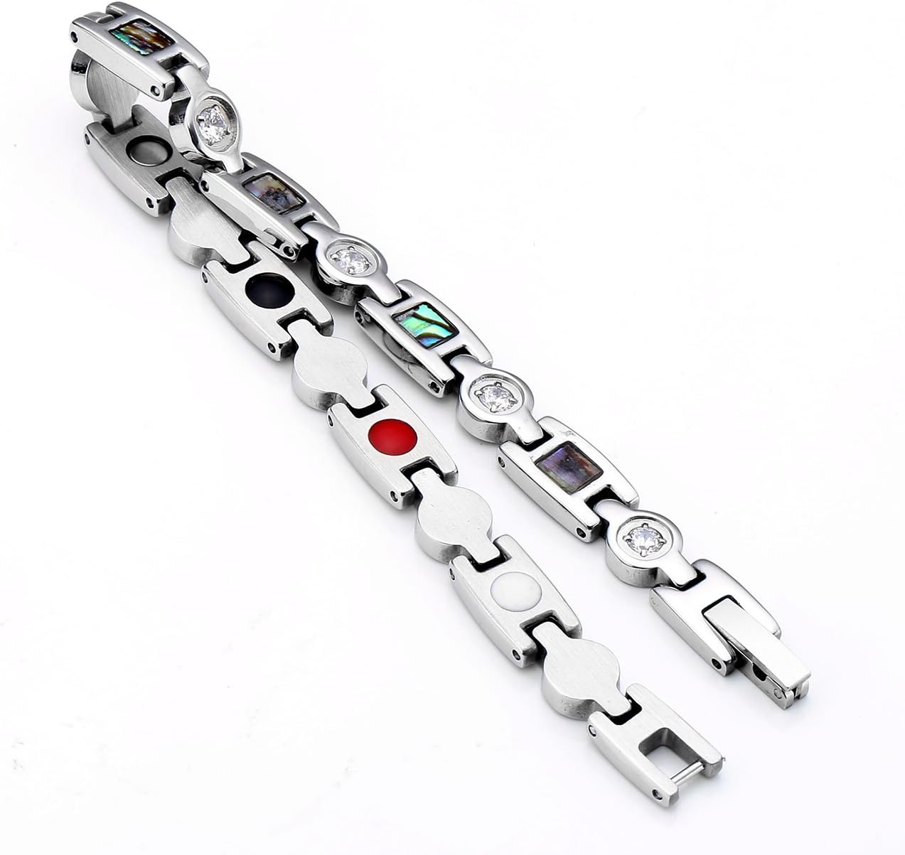 Add a touch of elegance and wellness to your look with this women's stainless steel magnetic bracelet. Crafted from high-quality stainless steel and accented with sparkling zirconia, this 7mm wide bracelet features a magnetic clasp and comes with an adjustable length tool for a customized fit. A perfect gift for any occasion.