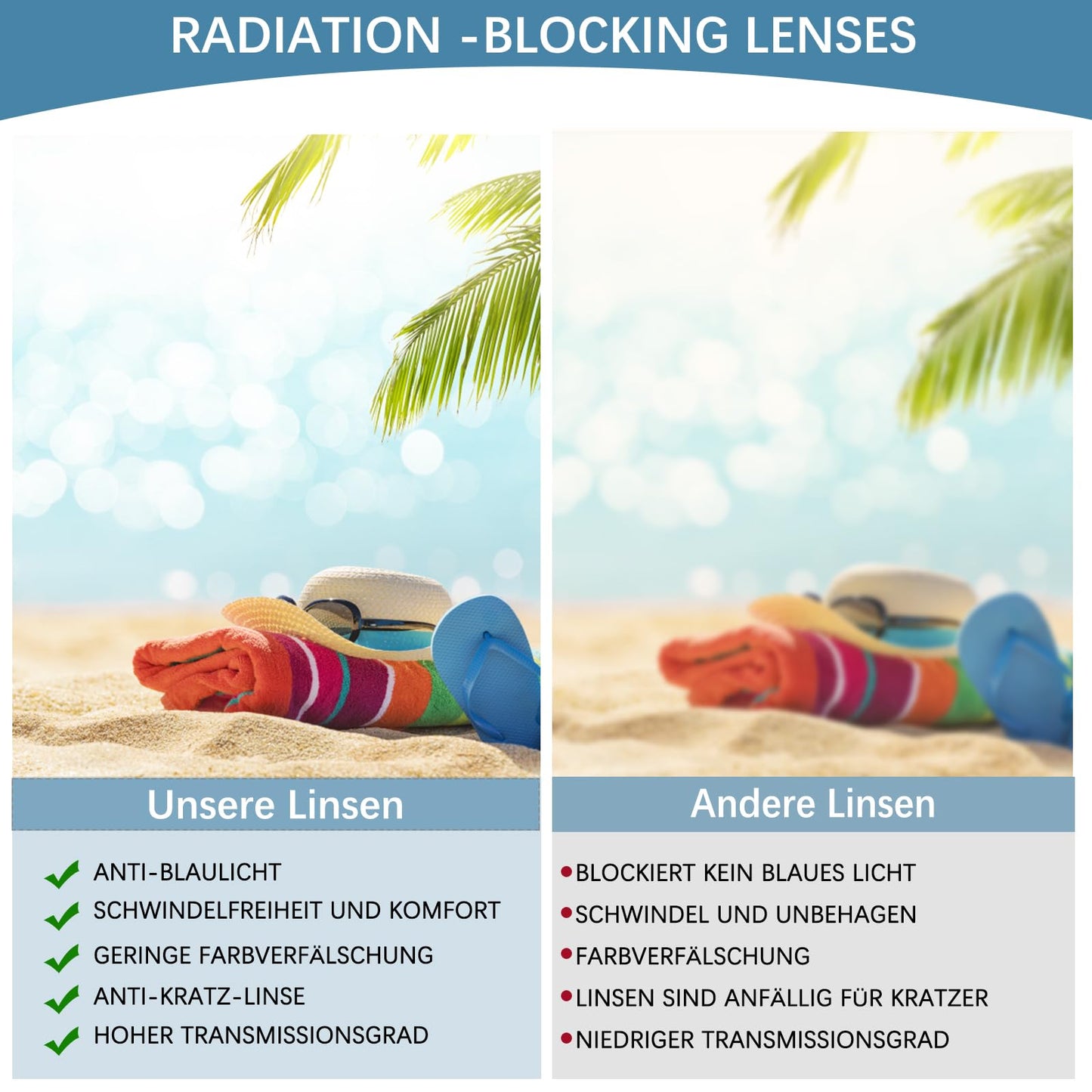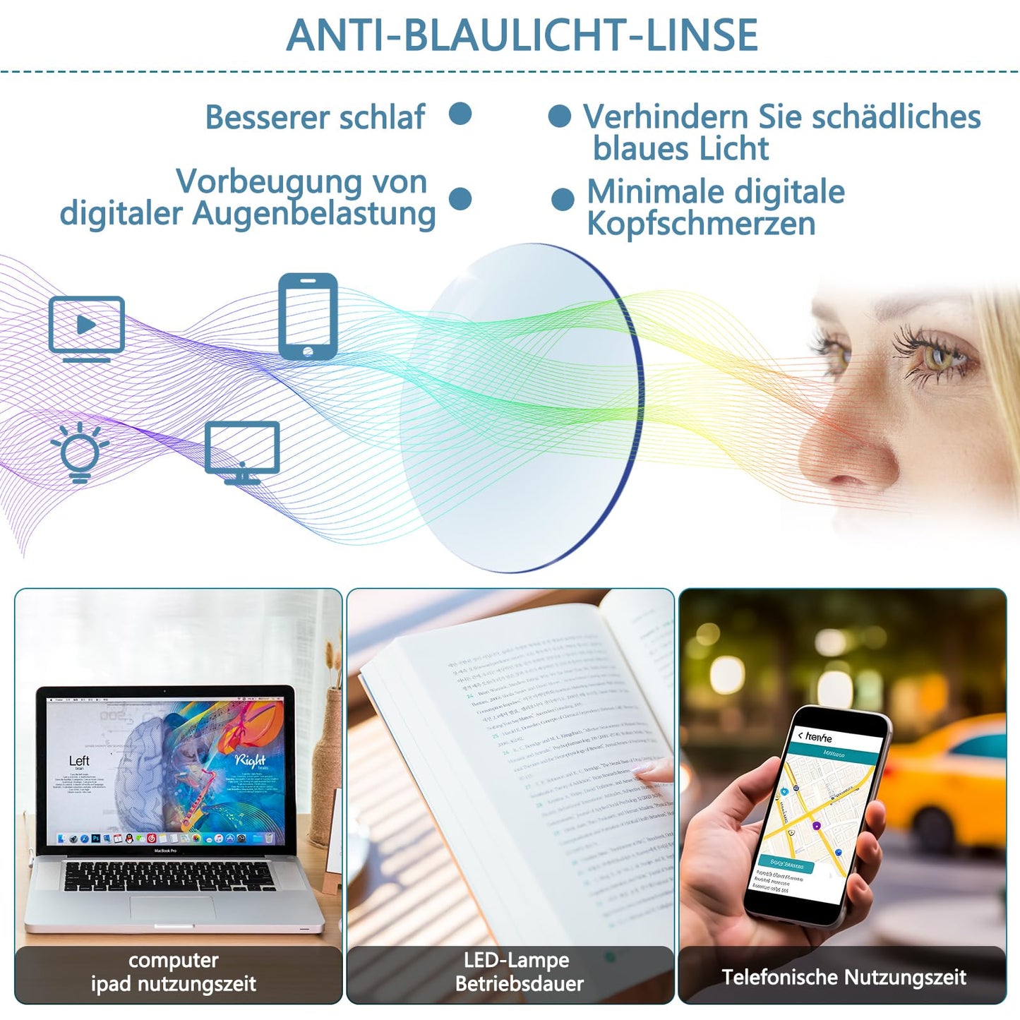 - Blaulichtschutz: Blockieren Sie alle schädlichen UVA- und UVB-Strahlen, um Ihre Sicht zu verbessern. Anti-Blaulicht-UV-Linsen können schdliches blaues Licht, das von Mobiltelefonen / Computern / Fernsehgerten usw.