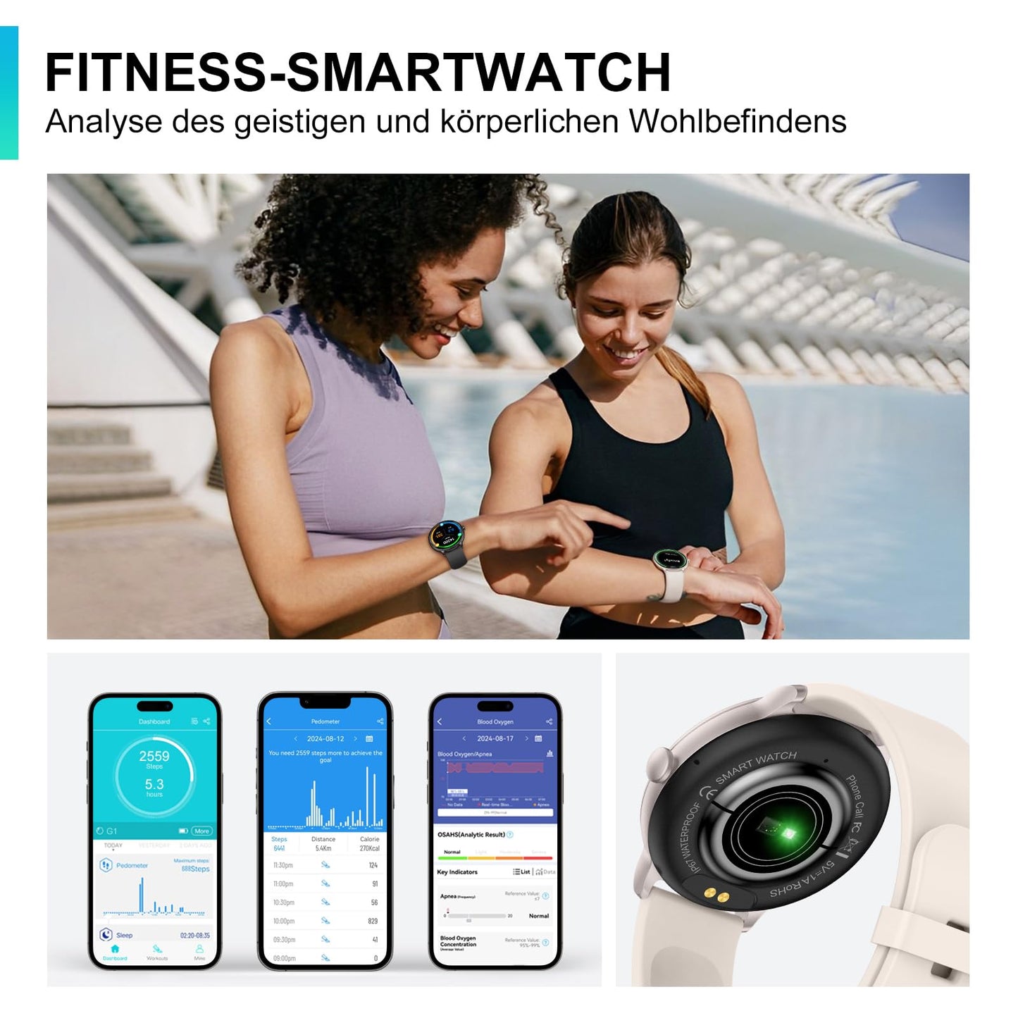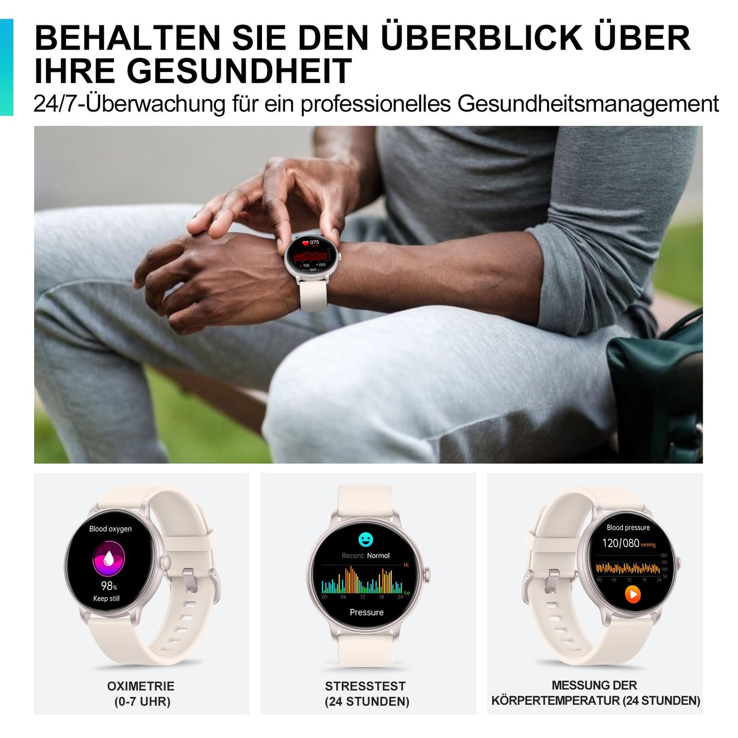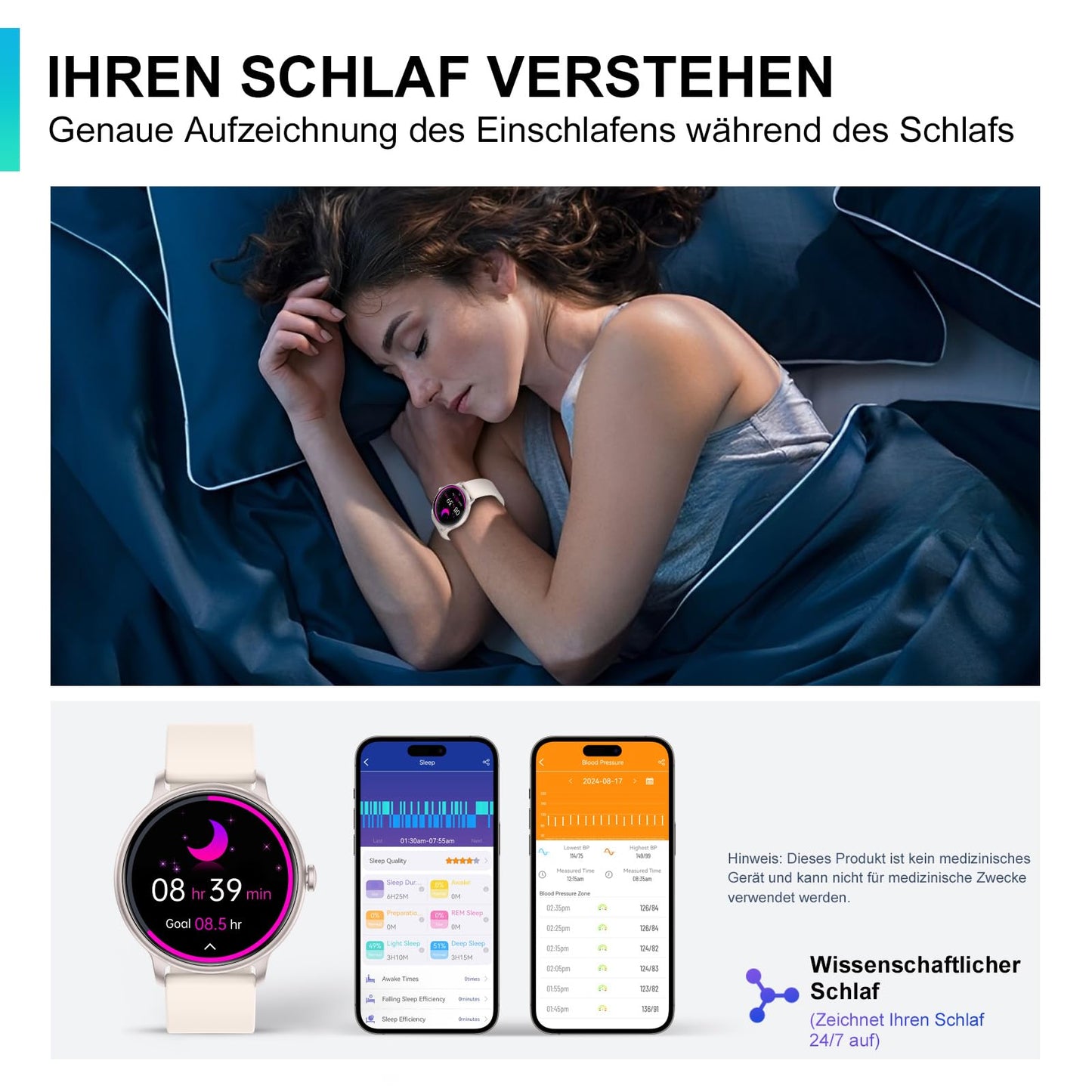- 24-Stunden-Gesundheitsüberwachung: Die Smartwatch verfügt über fortschrittliche Sensoren, die Ihre Gesundheitsdaten genau überwachen und aufzeichnen und eine umfassende Analyse der Schlafqualität liefern. Hinweis: Es wird nicht empfohlen, mit der Uhr zu duschen oder zu schwimmen.