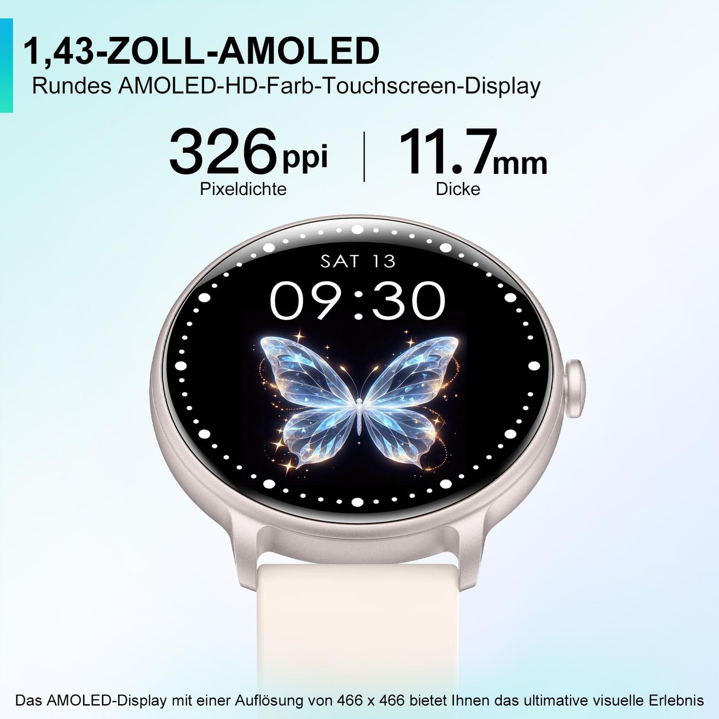 ZPPSNFIT Smartwatch Damen Herren, 1.43 Zoll AMOLED-Display Smart Watch mit Bluetooth Anrufe, Fitness Tracker mit Herzfrequenz Schlafmonitor, IP68 Wasserdicht Fitnessuhr für Android iOS