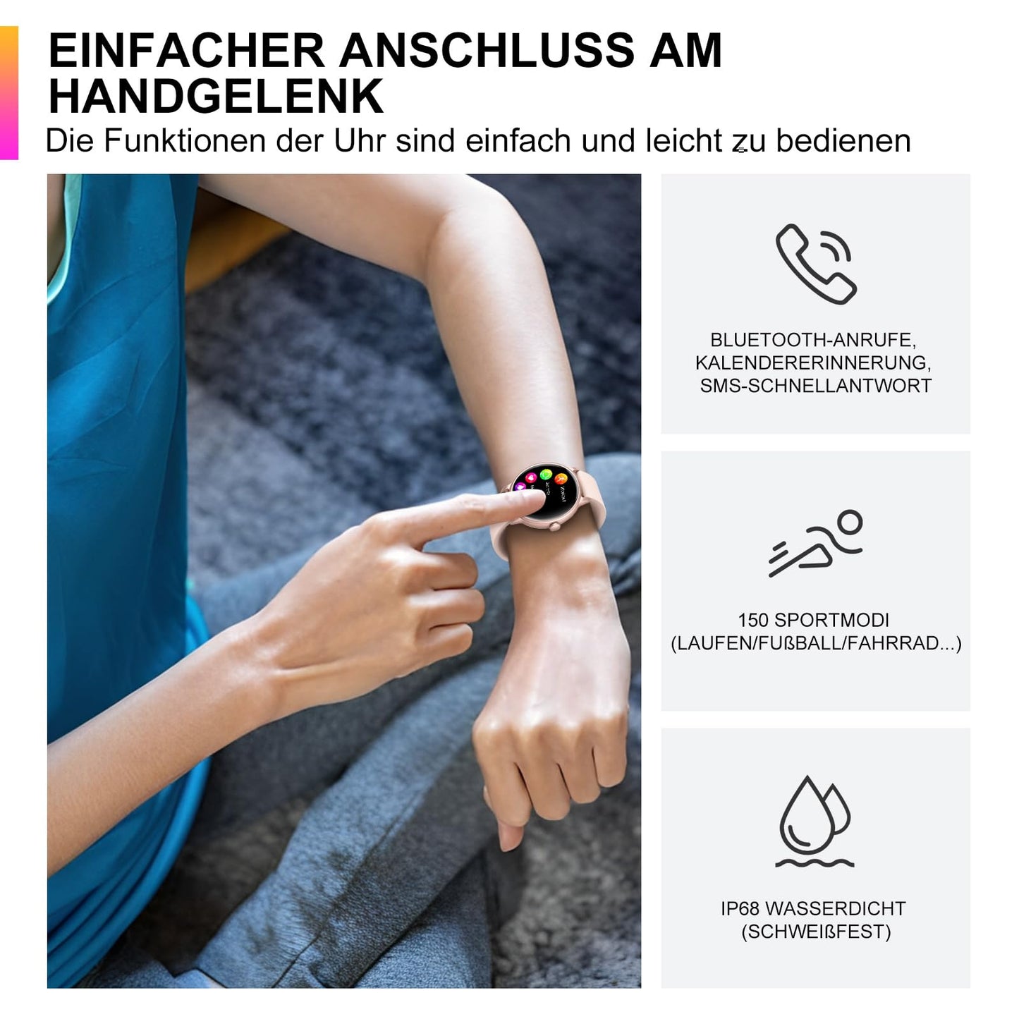 - Mehr als 150 Sportmodi und IP68-Wasserdichtigkeit: Die AMOLED-Smartwatch unterstützt zahlreiche Sportmodi, darunter Laufen, Radfahren, Gehen, Fußball usw., und zeichnet Ihre Daten auf. Die wasserdichte Smartwatch kann für eine breite Palette von Aktivitäten verwendet werden.